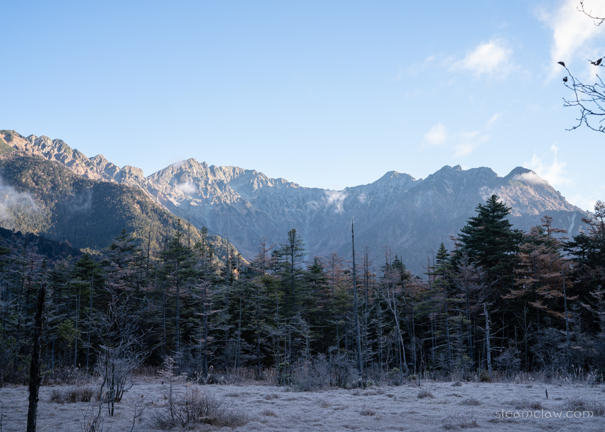 大正池から先は田代湿原となりますが、まだ陽が登りきっていないので暗く、あまり見栄えの良い写真は撮影できず。ここは上高地の谷間にも陽がさすような時間帯になってからのほうが写真撮影には向いているかもしれません。