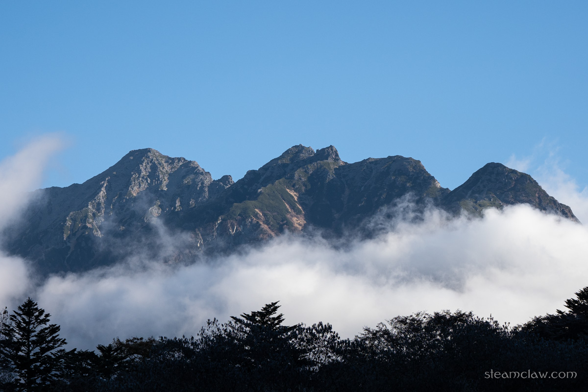 まだ陽が出てからそれほど経ってないというのに、すでに焼岳から西穂高岳にかけて濃厚なガスが稜線をこえて流れ込んできているのが気になりますが…🤔
