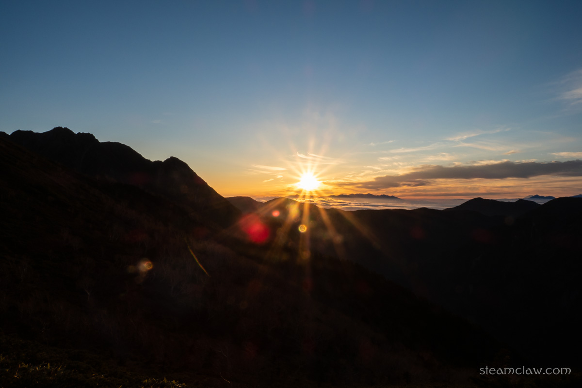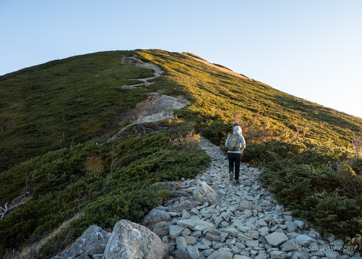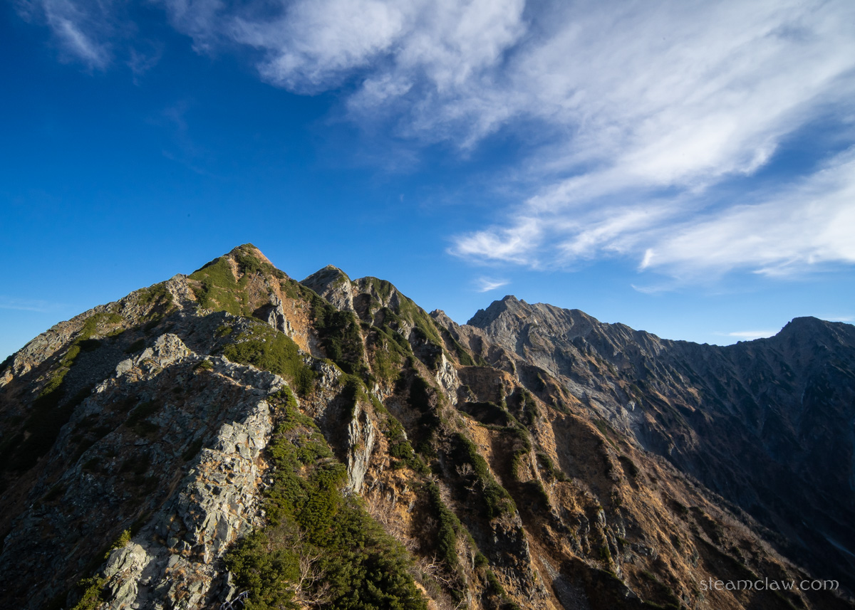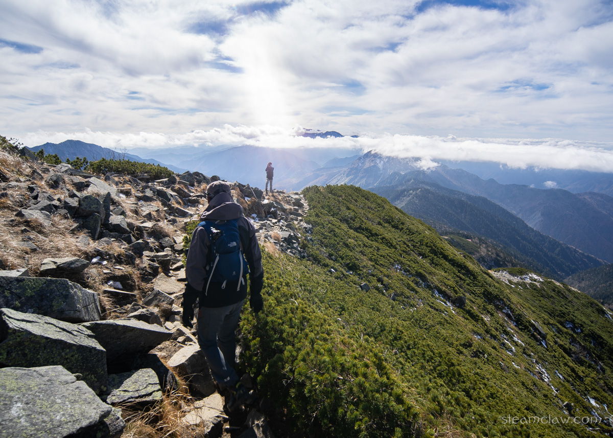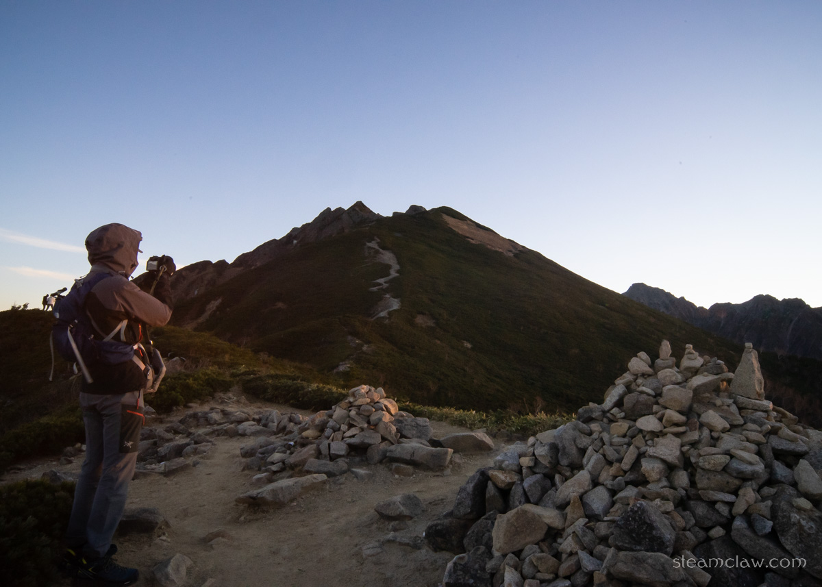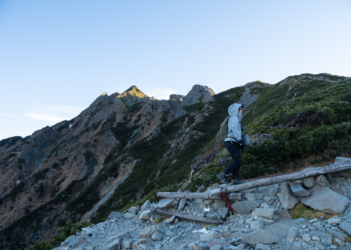 この日はちょうど朝日が登ってくるあたりに雲が漂っていて、ご来光撮影するのにはベストコンディションでありませんでしたが、それでも清々しい朝を迎えられて満足。まずは標高2,452mの西穂丸山を通過して西穂独標に向かいます。