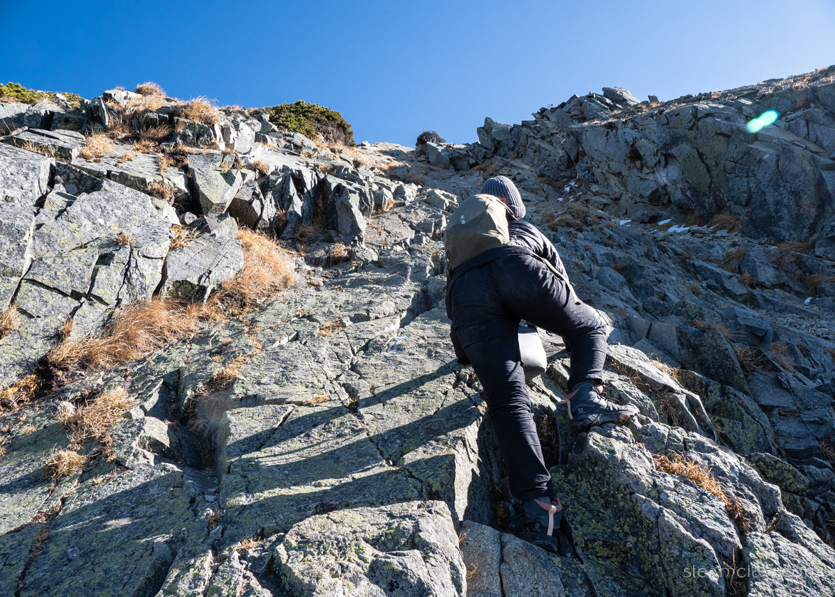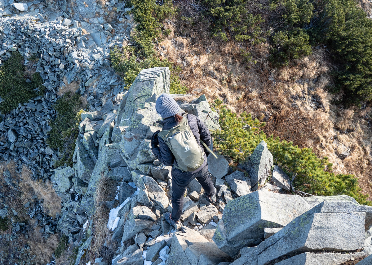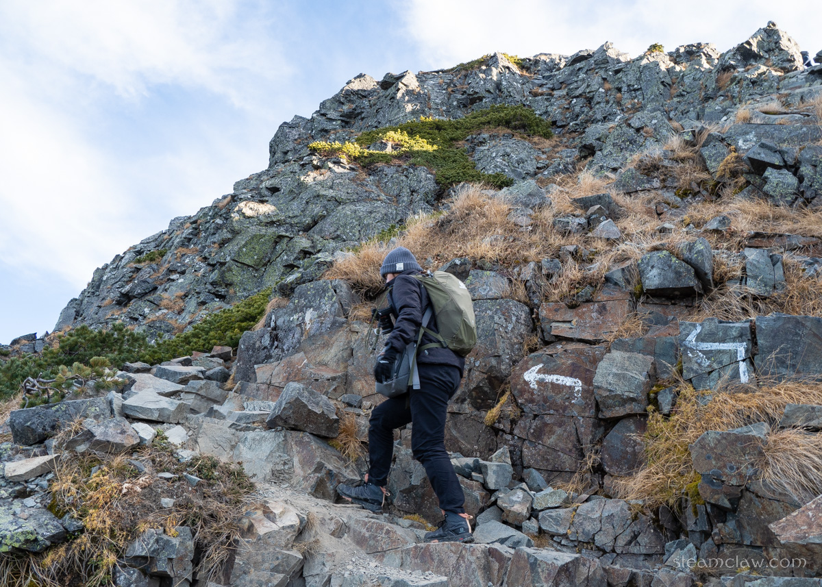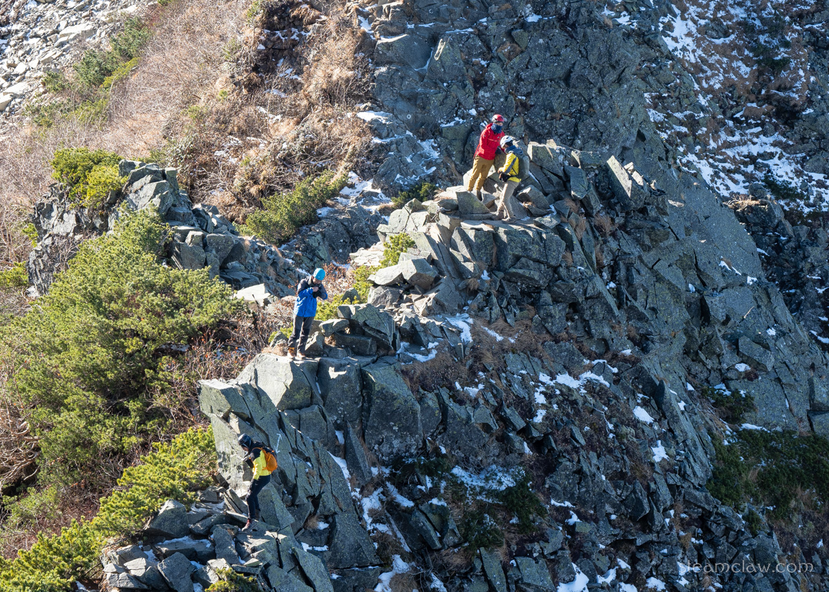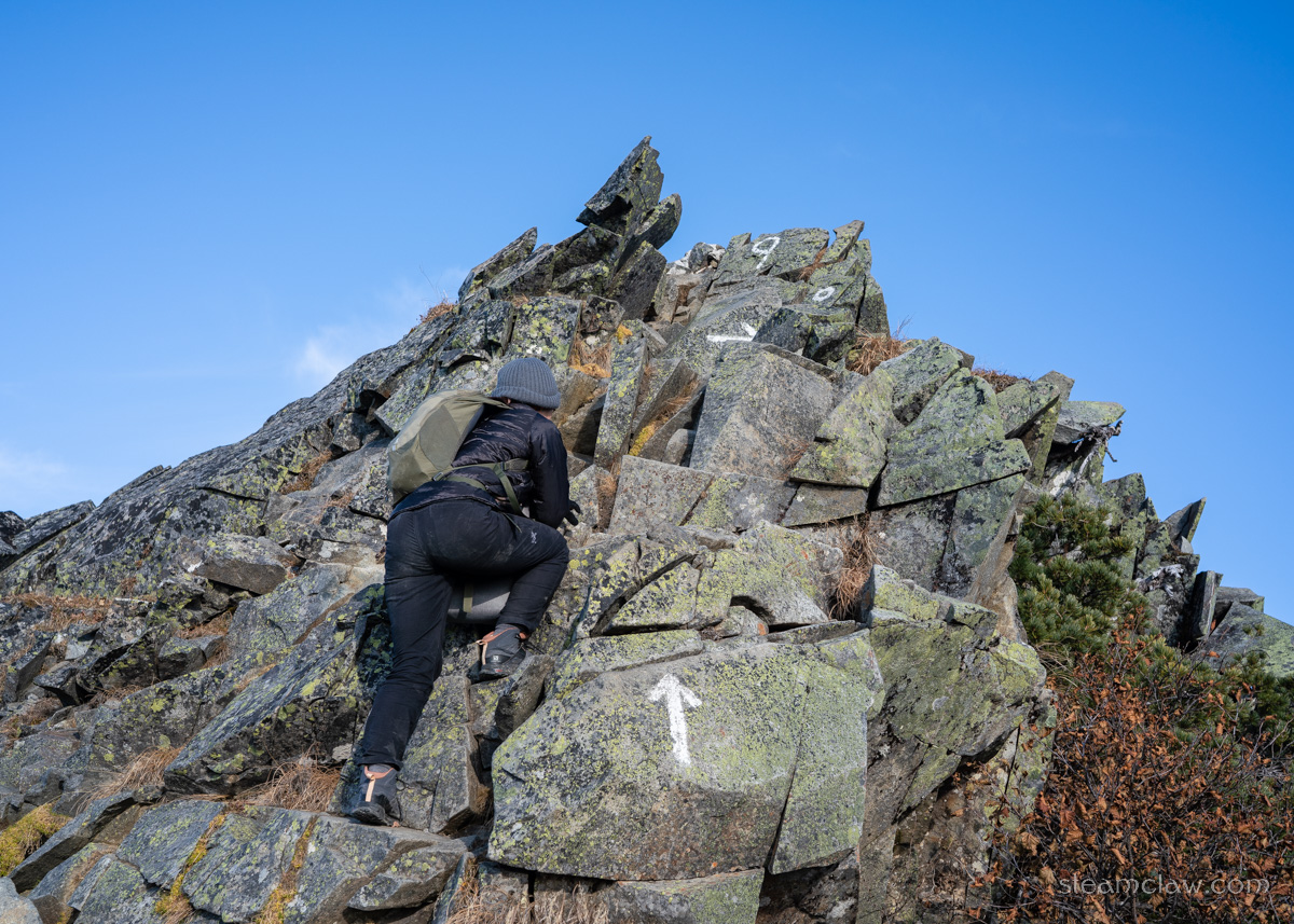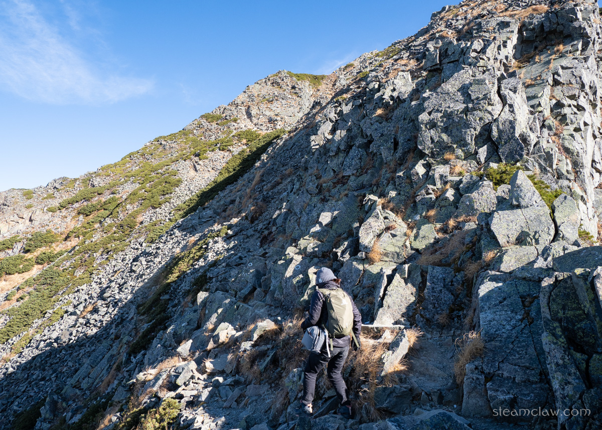 ガレた道を登りきると、間もなく独標への最後の登り。ここは距離こそ短いですが、やや急陵な岩場となっているので、ロープウェイ頼みでやってきた軽装の観光客だと怖じ気付いてしまうかもしれません。我々が帰りに通過したときも「私はもう無理だから先に行ってて」と相談しているハイカーさんと遭遇しました。