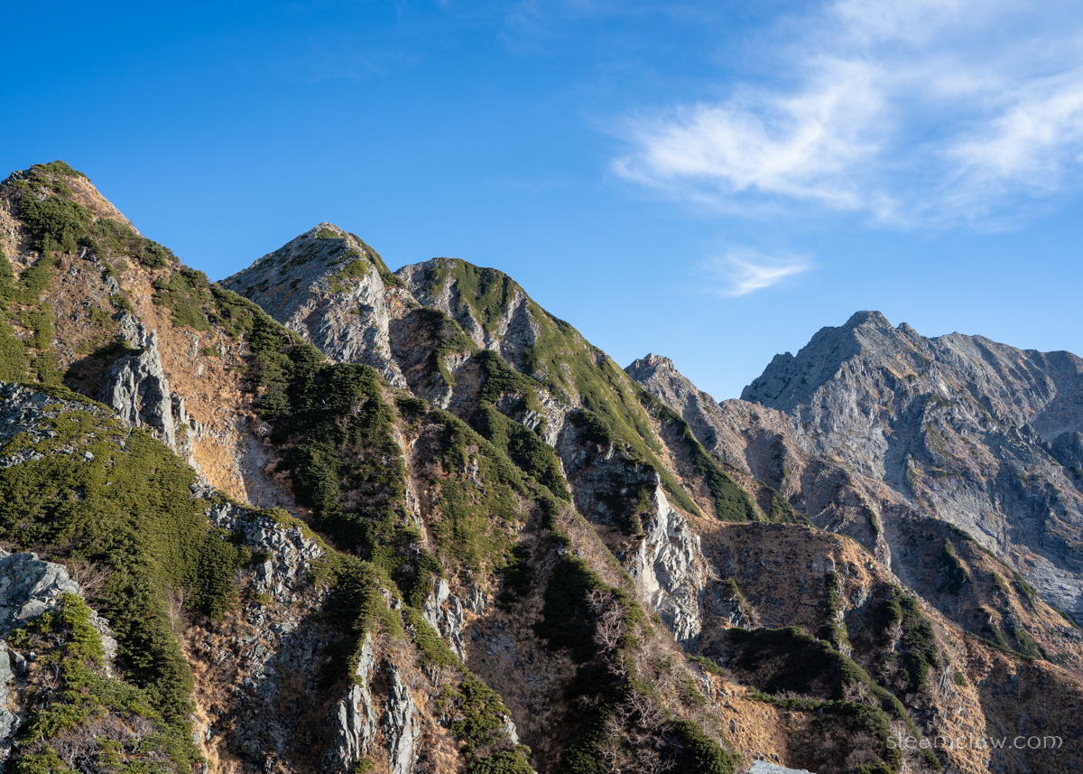 チャンピオンピークまでくれば、もう西穂高岳主峰は目と鼻の先。ピラミッドピークの先と同様、3峰と2峰も登頂するのではなく岐阜側を巻いていくのでアップダウンは少ないですが、ガレ気味のところが多いので、石に毛躓いたりしないよう注意して登っていきます。