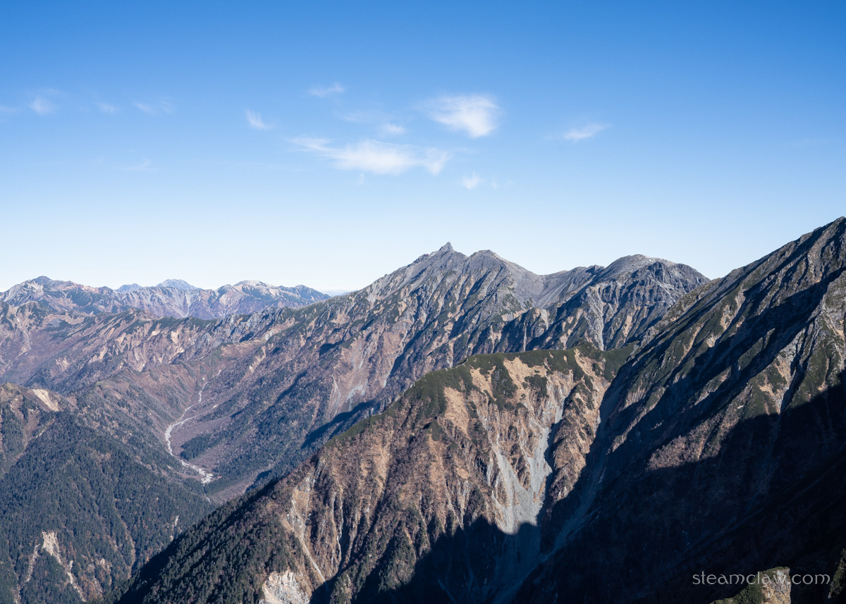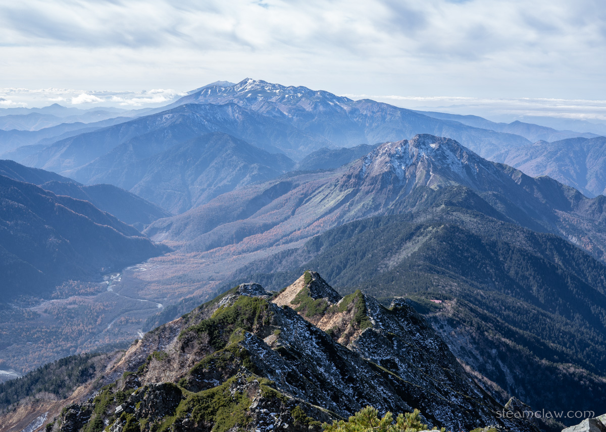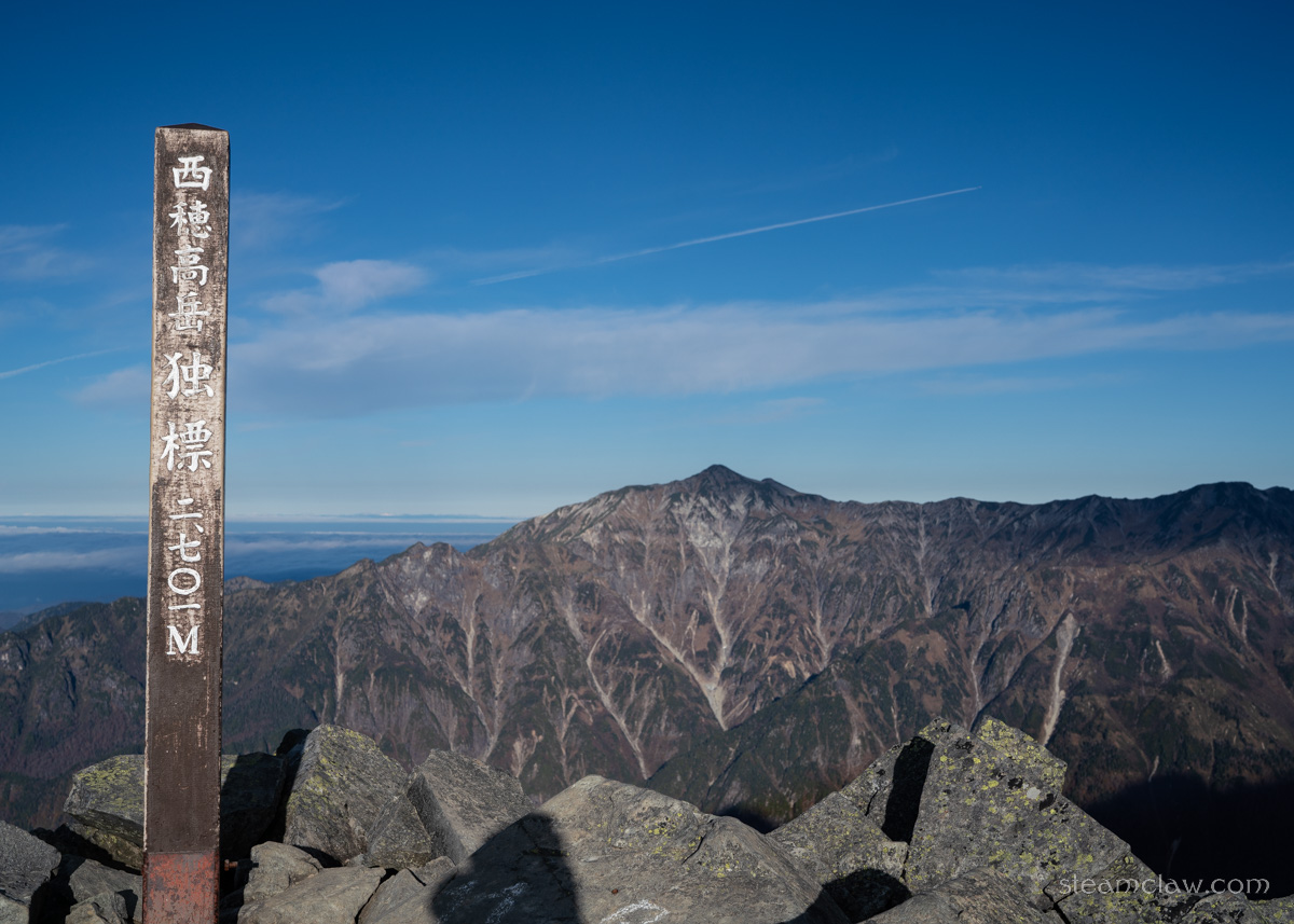 西穂独標からの展望も良かったですが、槍・穂高連峰やその先の北アルプスまでの眺めは主峰まで来なければ得られませんから、岩稜のアップダウンを越えて遥々やってきた甲斐もあるというものです。