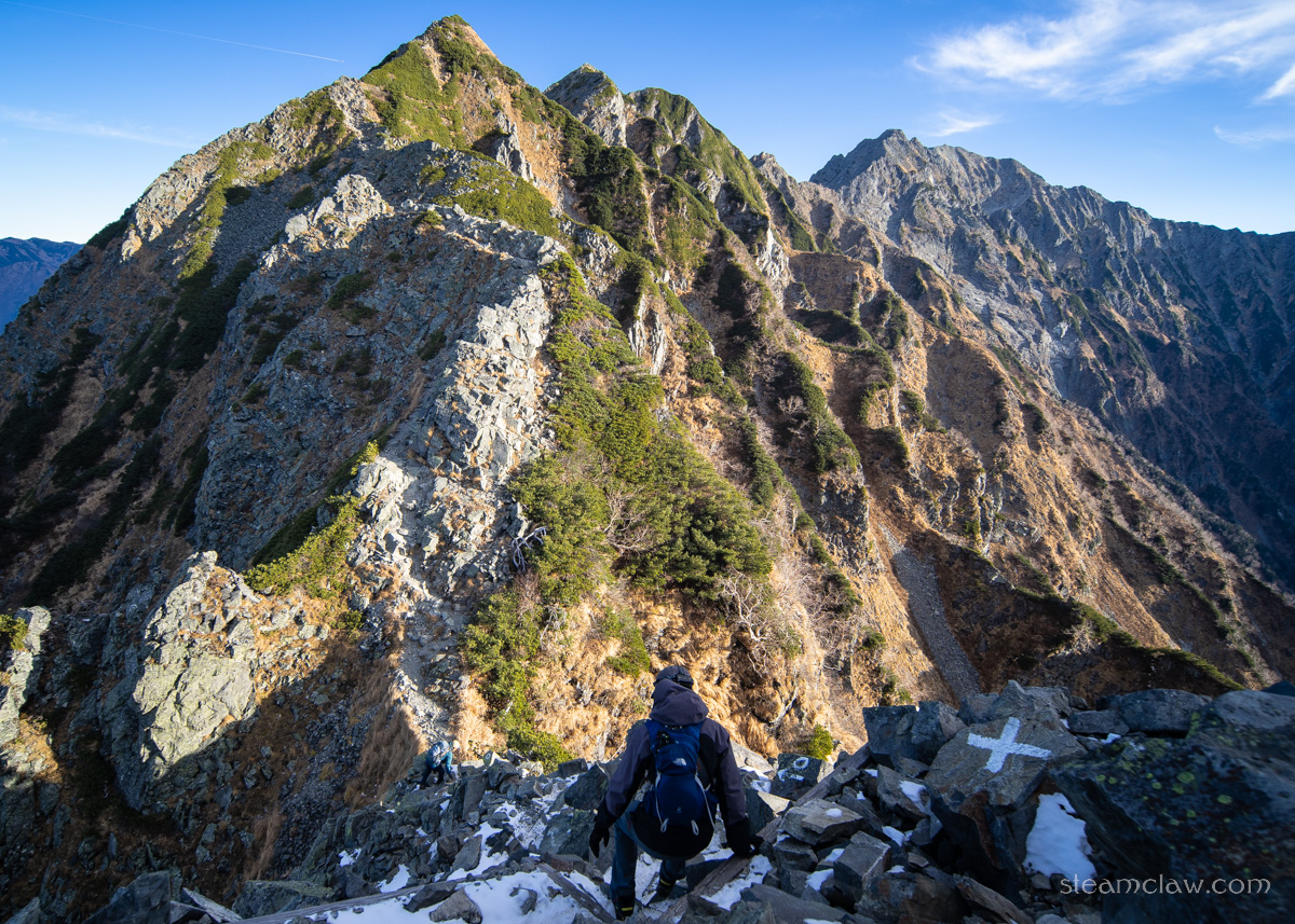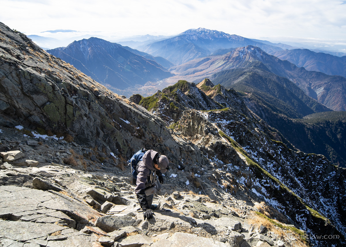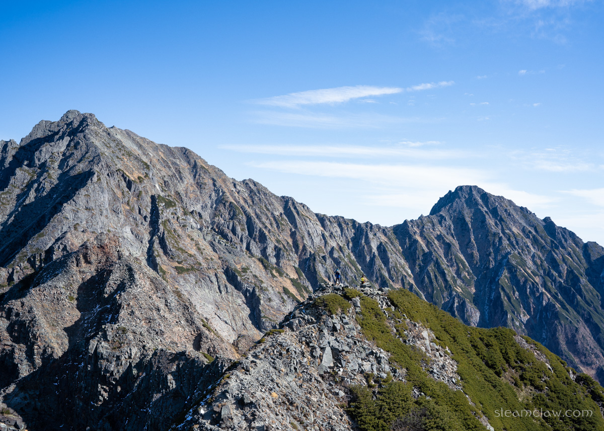 西穂高岳は11のピークからなっており、先ほど通過した西穂独標が11峰。つまり西穂高岳(=1峰)へは岩稜の登り降りをあと10回繰り返さなければなりません。僕個人は180センチの身長のおかげでゴリ押しして進めるのですが、155センチほどの嫁さんは、かなり苦戦している様子。