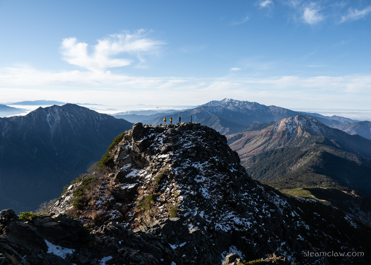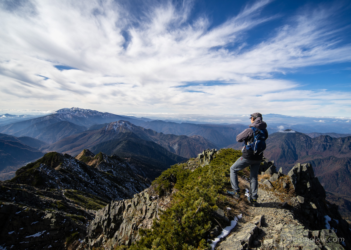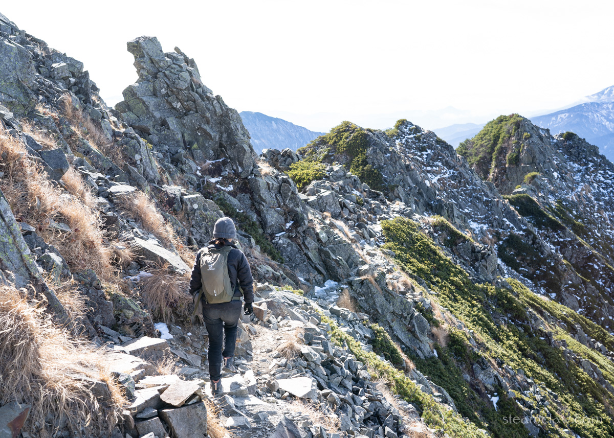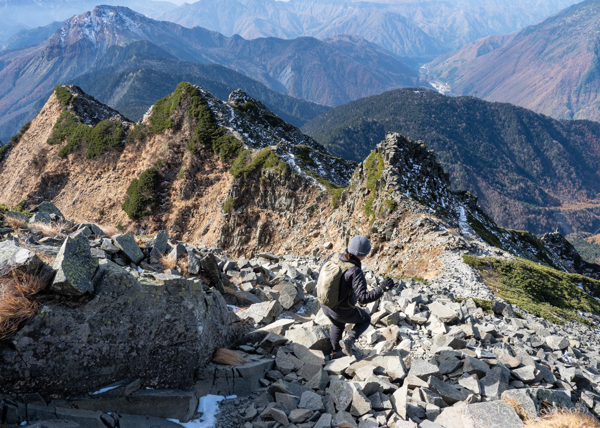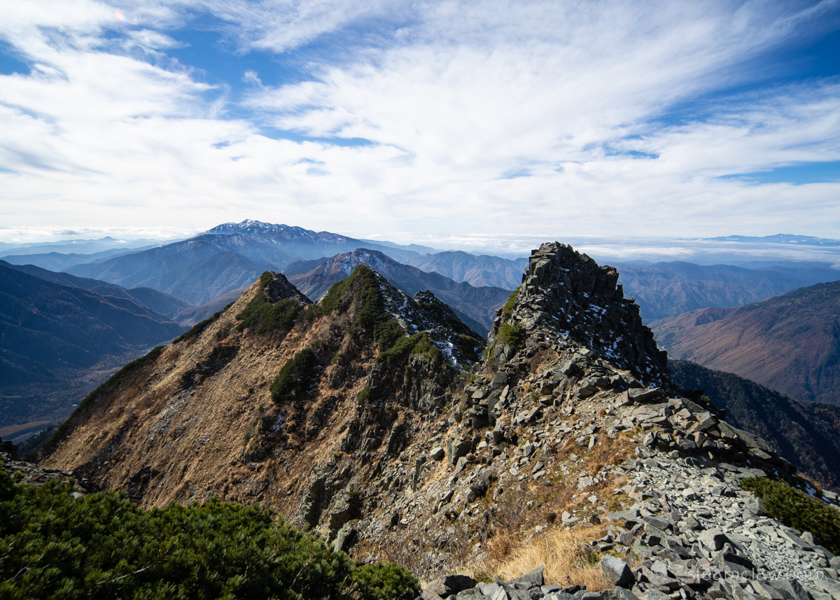 景色はもちろんですが、心臓が震えあがるほど難しいわけではない、ちょうど良い難易度の岩稜が続いていくので、歩いていて楽しい山だなという印象。最初はビビリあがっていた嫁さんも、復路には楽しかったと言い始めていたので、岩尾根入門としては悪くないかもしれません。