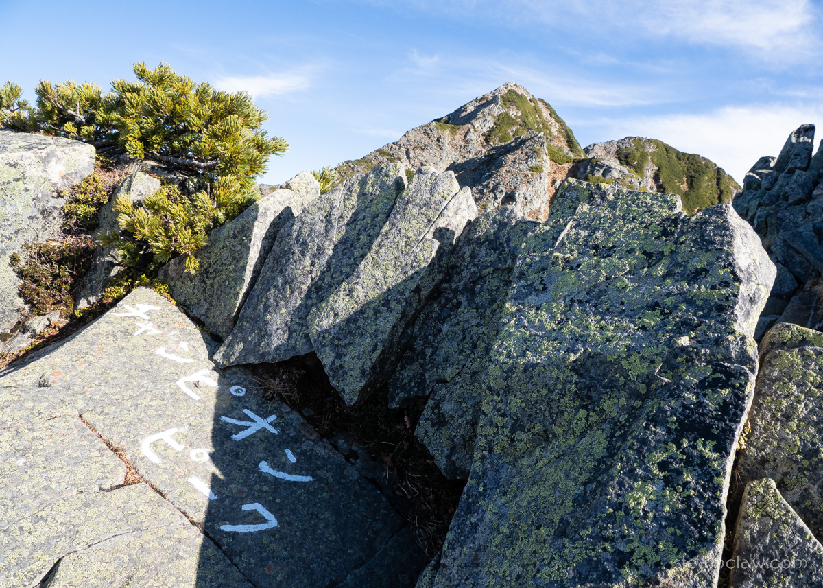 主峰直下はさすがに手強い登りが待っており、手も使ってしっかり慎重に進んでいく必要あり。通常であればこういうところはクサリが設置してあるんでしょうけど、西穂高岳周辺は落雷が多いことを考慮してクサリをあまり設置しない方針になっているようですね。