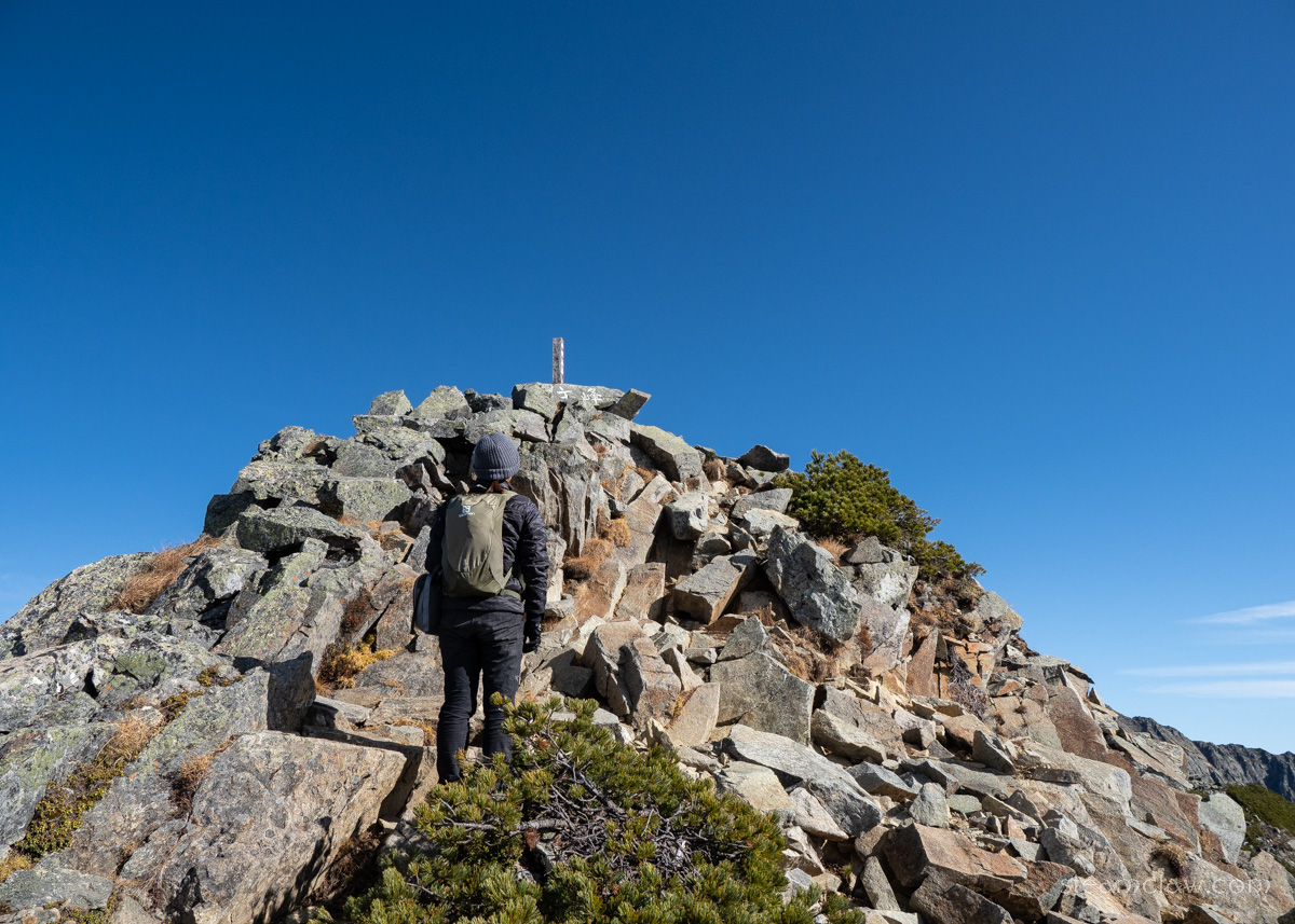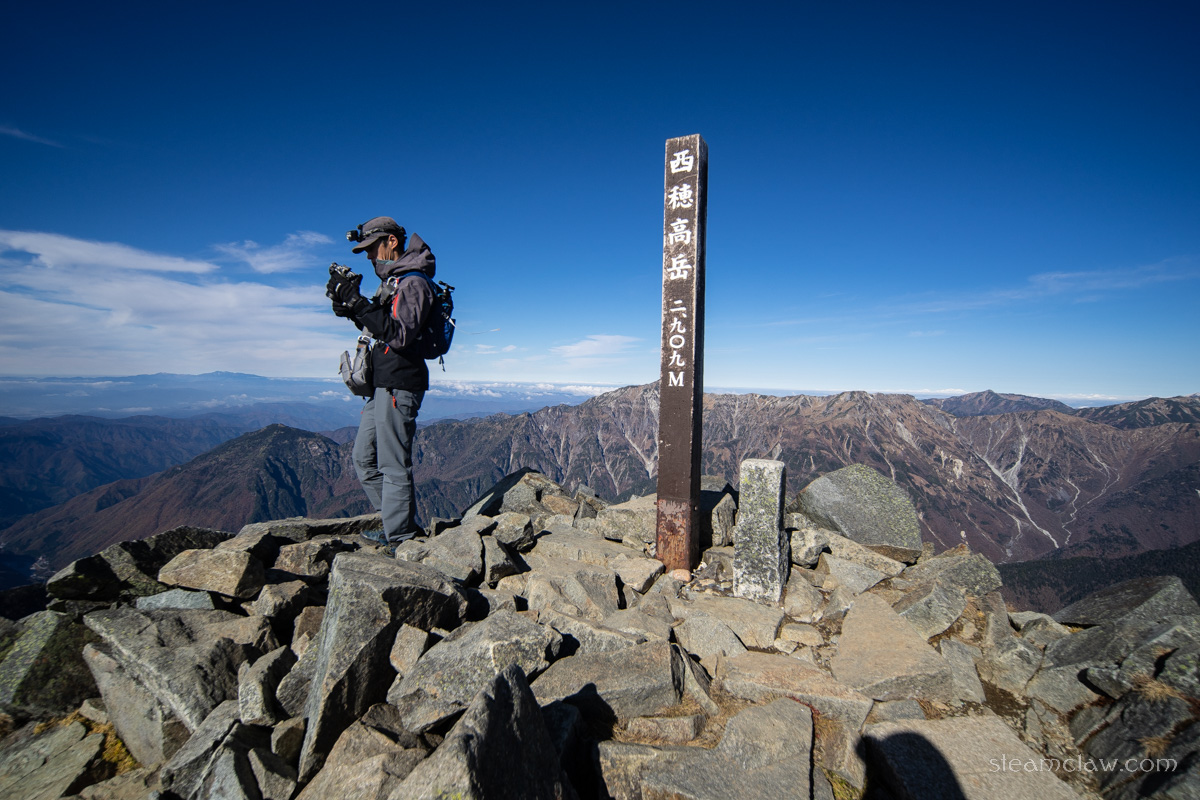 西穂高岳は岩稜上にあるので当然といえば当然ですが、主峰山頂は狭く、あまりのんびり休憩できる場所ではありません。混雑している場合は、間ノ岳方面に1つ先の小ピークまでは安全に進めそうですので、そこで休憩するというのもアリかもしれませんね。