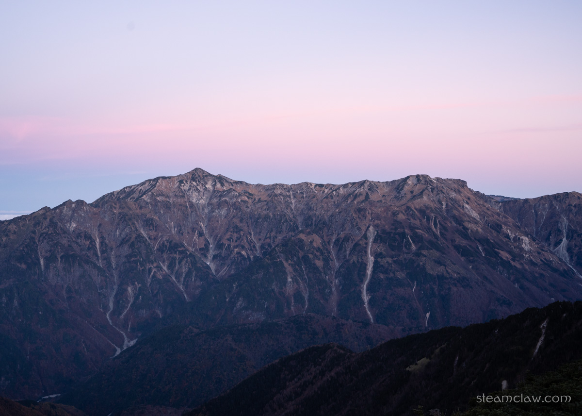 笠ヶ岳も少しずつ朝日に染まりはじめています