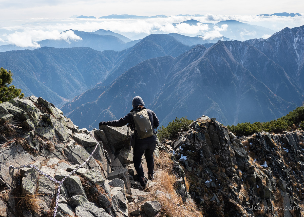 ちょっと嫌らしいなと思ったのは9峰を通過した先の下りにある痩せ気味の岩尾根。鞍部の手前に、突きでた岩を向かって左手に回り込んで進まなければならないところがあるのですが、180センチある自分でも「うーん、ちょっと頑張らないと届かないな」というところに足場がある感じ。