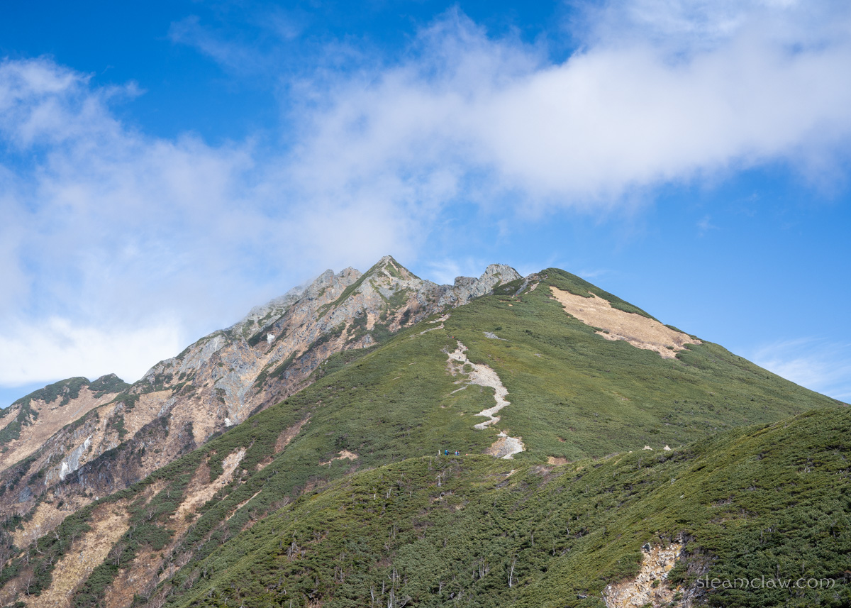 振り返ると、焼岳、乗鞍岳そして霞沢岳が朝日に照らされ始めているのが見えます。向かって左手には標高2,898メートルとなる笠ヶ岳。山頂までの最短ルートとなる笠新道の急勾配が有名ですね。ここからはずっと、この笠ヶ岳と並走しながら登っていくことになります。