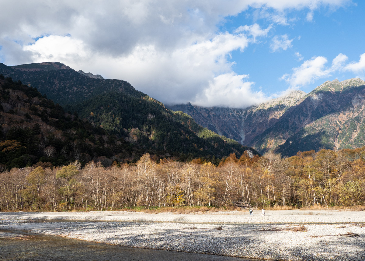 梓川沿いを歩きながら左手に西穂高岳がみえたのですが、雲が覆いかぶってきており、この調子だと遅くにやってきた人たちはガスにまみれながらの西穂高岳登頂になっていたかもしれません😢