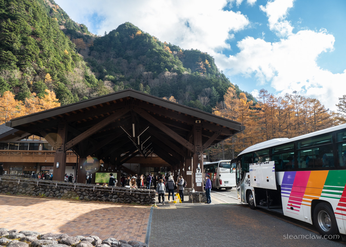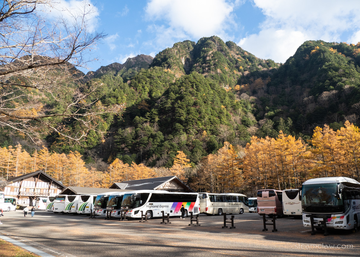 ハイシーズン時は大混雑だという噂の沢渡駐車場ですが、さすがにこの季節はバスターミナル最寄りの第三駐車場ですら半分埋まっているかいないか、という程度でした。