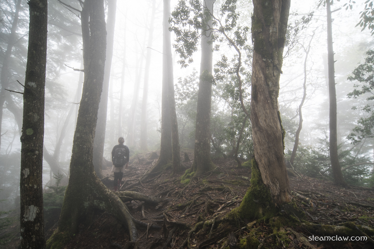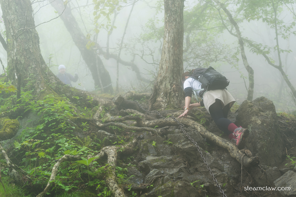 清滝小屋を過ぎたあたりから本格的にガスが濃くなり,10メートル先が見えるかもあやしいくらい.ここまでガスが濃くなると,どこにカメラを向けようが神秘的な雰囲気が漂うようになるので,これはこれで悪くありません.