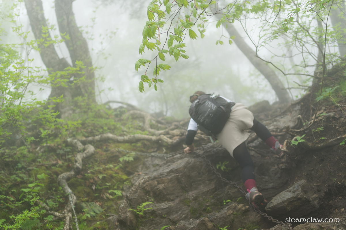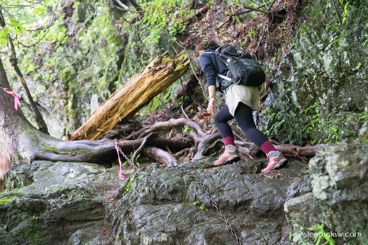 コース序盤で登場した鎖場よりもずっと傾斜はキツく,鎖なしでは厳しい箇所もあります.とはいえ鎖場の左右が切り立っているわけでもないので難易度としては低め.足元が濡れていたので復路は警戒しながらそろそろ降りましたが,登りはアスレチック感覚でガンガン進むことができます.