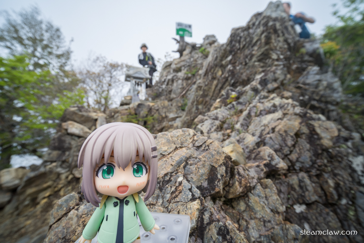 この日はコロナ警戒明けかつ天気もそんなに良くなかったので人も少なく,休憩スペースを無事確保することができました.前回記事の御前山にて初登場した「雪村あおい」ねんどろいどフィギュアと一緒に撮影してみましたが,パースかかりすぎ&周辺部流れすぎでワープしているような写真になってしまった….焦点距離10mmは広角側に寄せすぎましたね.
