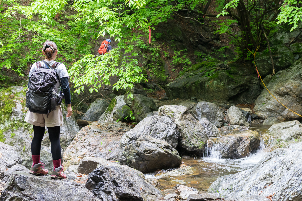 薄川コースを進む場合は会所の少し先で渡渉.前日まで雨が降っていたことで普段より水量が多いのか,渡渉箇所を少し考えさせられるような状況でした.流されるような危険箇所はありませんでしたが,この先も何度か渡渉しながら登っていくことになるので,台風など大雨のあとに登る場合は気をつけたほうが良いかと思います.