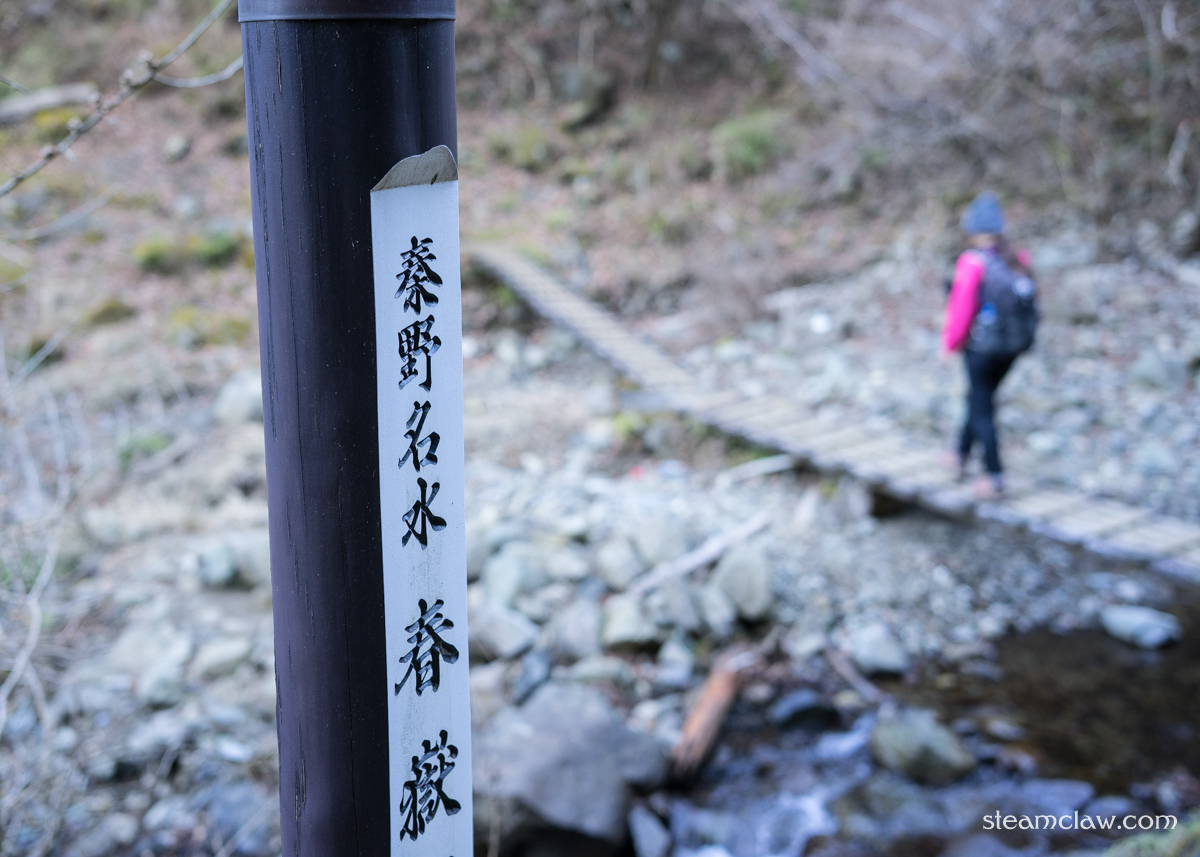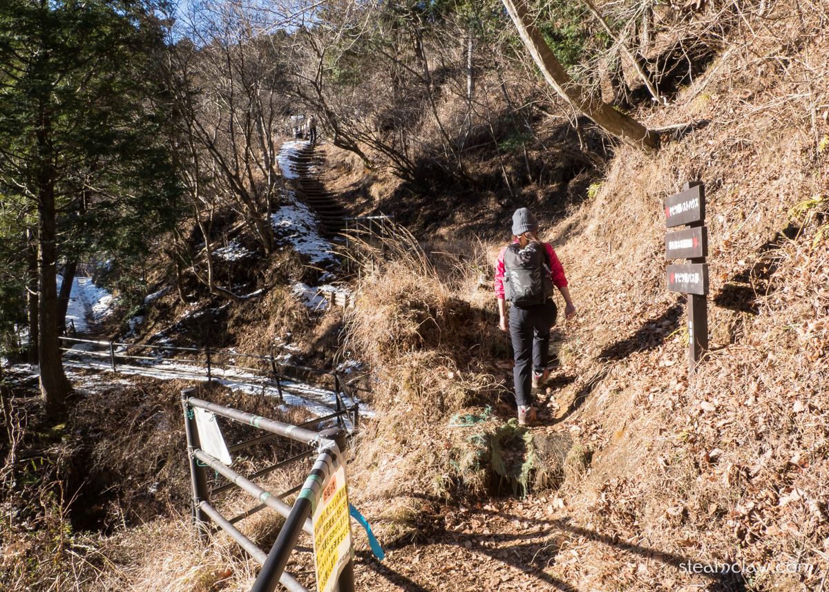 木橋で金目川を対岸に渡ったあたりで舗装道は終わり登山スタートとなります.木橋の上流側には「髭僧の滝」があり,登山道はじまってすぐの箇所からアクセス道が分岐しますが,この日の目標は塔ノ岳なので通過.真冬とあって肌寒く,神奈中バスがヤビツ峠ではなく蓑毛止まりになっていることからヤビツ峠に積雪があることはほぼ確実なのですが,まだ積雪はありません.