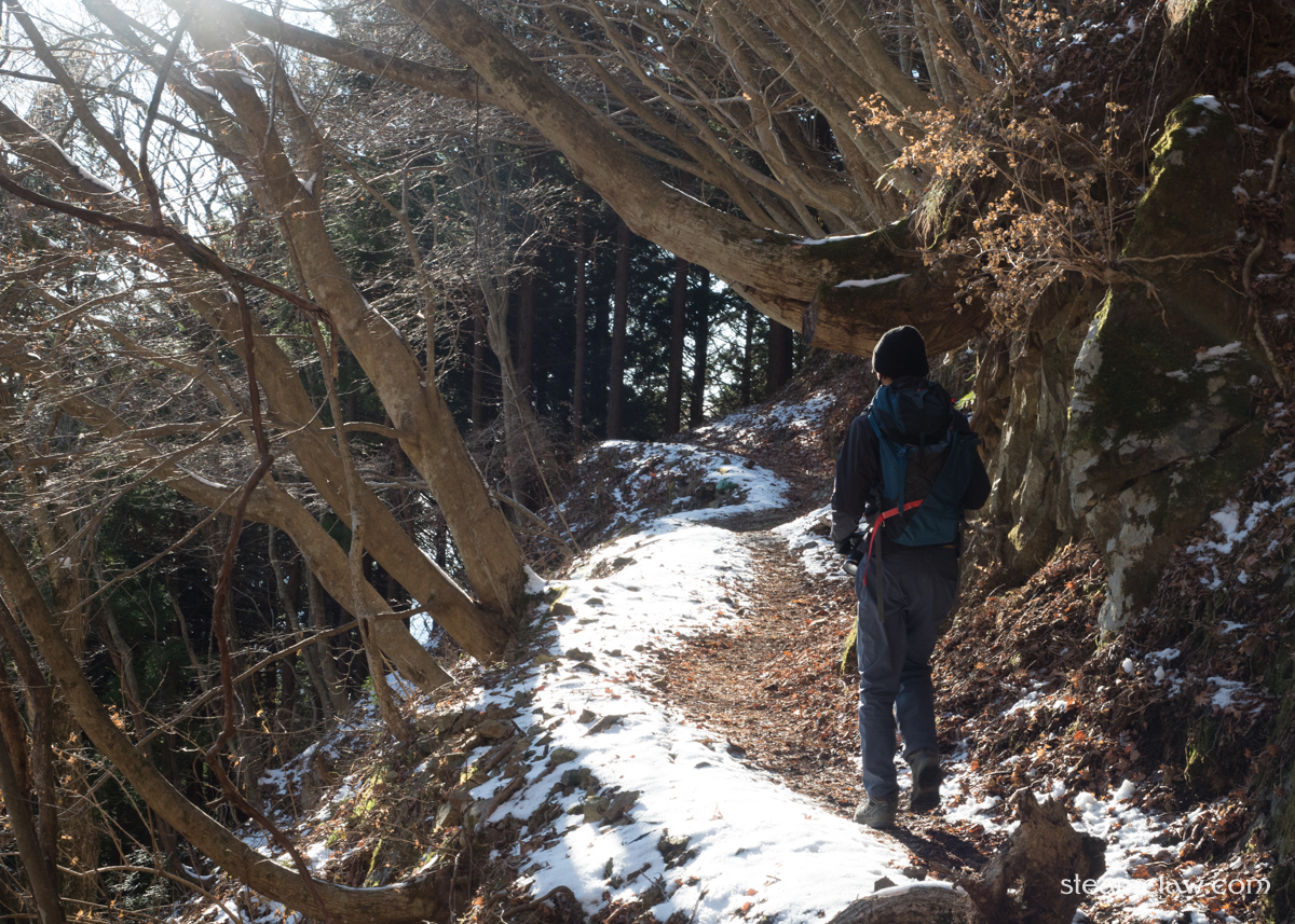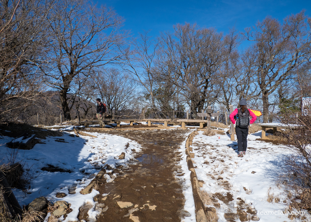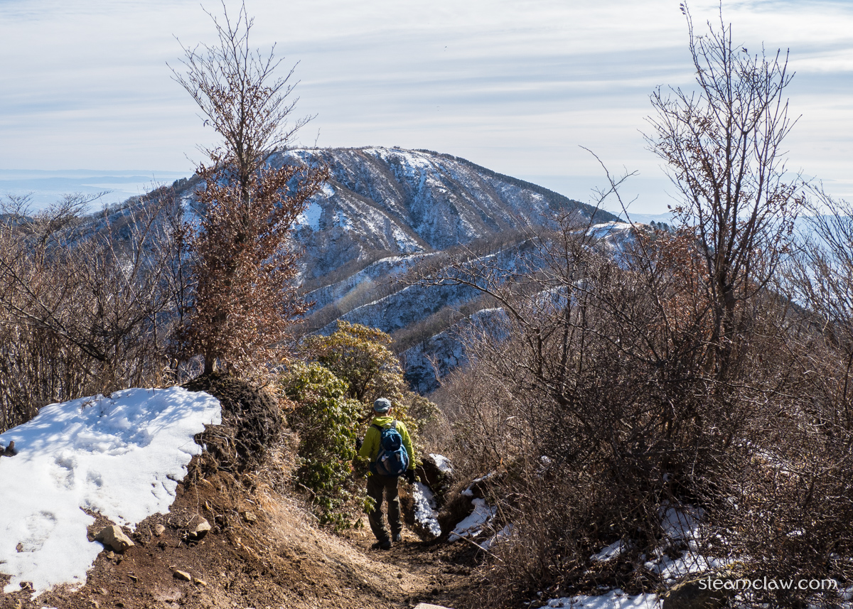 この烏尾山との鞍部までの下りは表尾根コースの中でも特に傾斜がキツく,かつ西側斜面なので雪が残りやすい.コース上他のところは問題なくても,ここだけはチェーンスパイクが欲しくなることが多いです.積雪が予想される際は念のためチェーンスパイク持っておくと良いでしょう.
