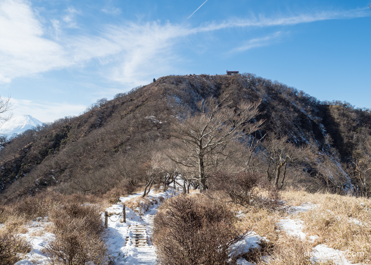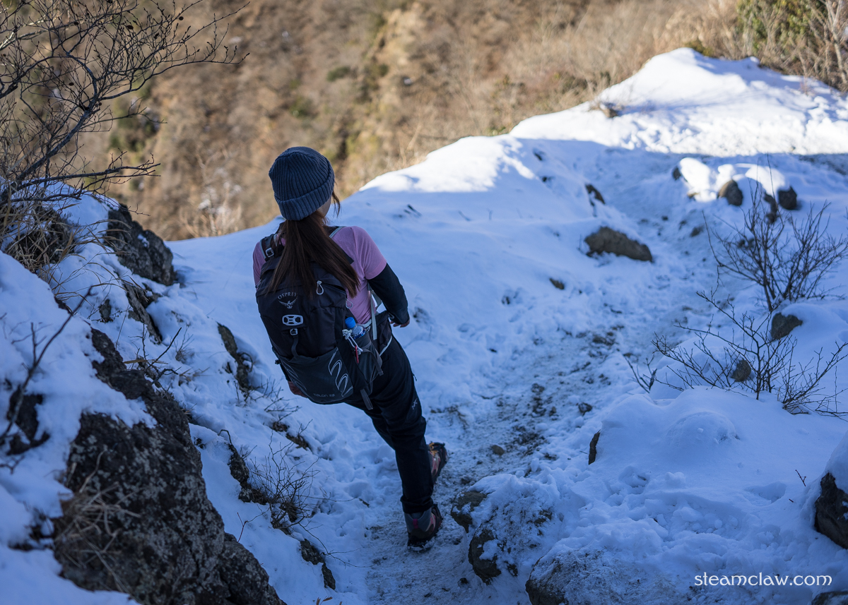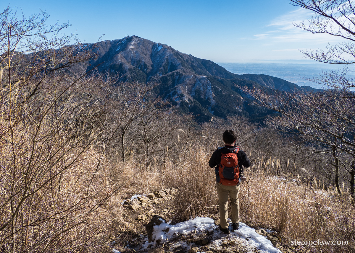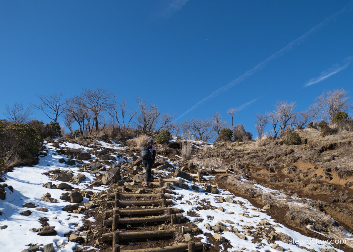 この烏尾山との鞍部までの下りは表尾根コースの中でも特に傾斜がキツく,かつ西側斜面なので雪が残りやすい.コース上他のところは問題なくても,ここだけはチェーンスパイクが欲しくなることが多いです.積雪が予想される際は念のためチェーンスパイク持っておくと良いでしょう.