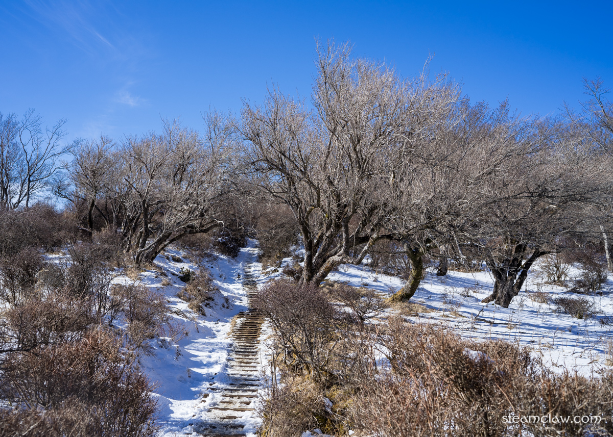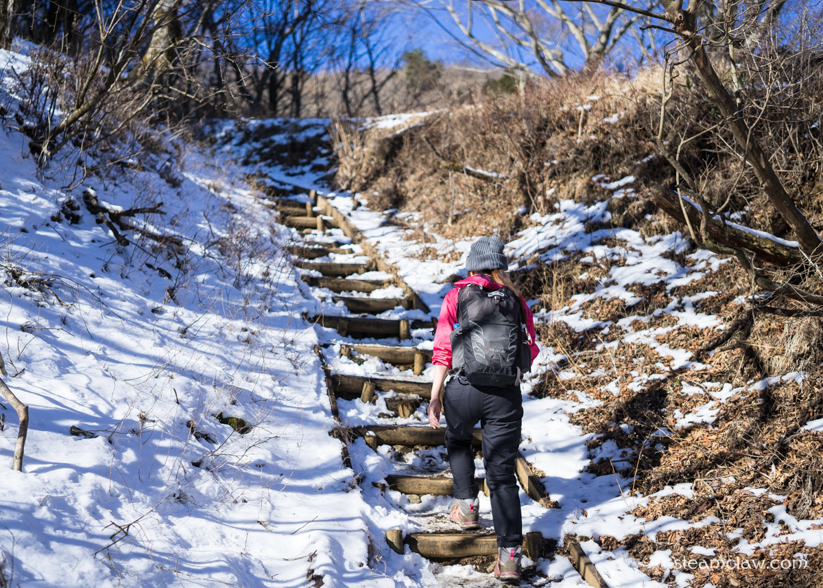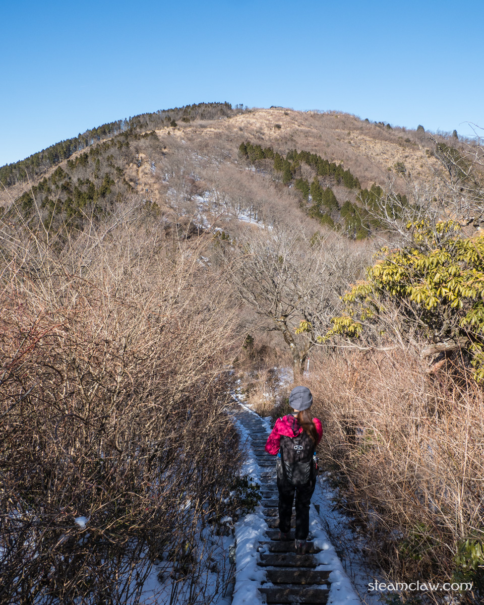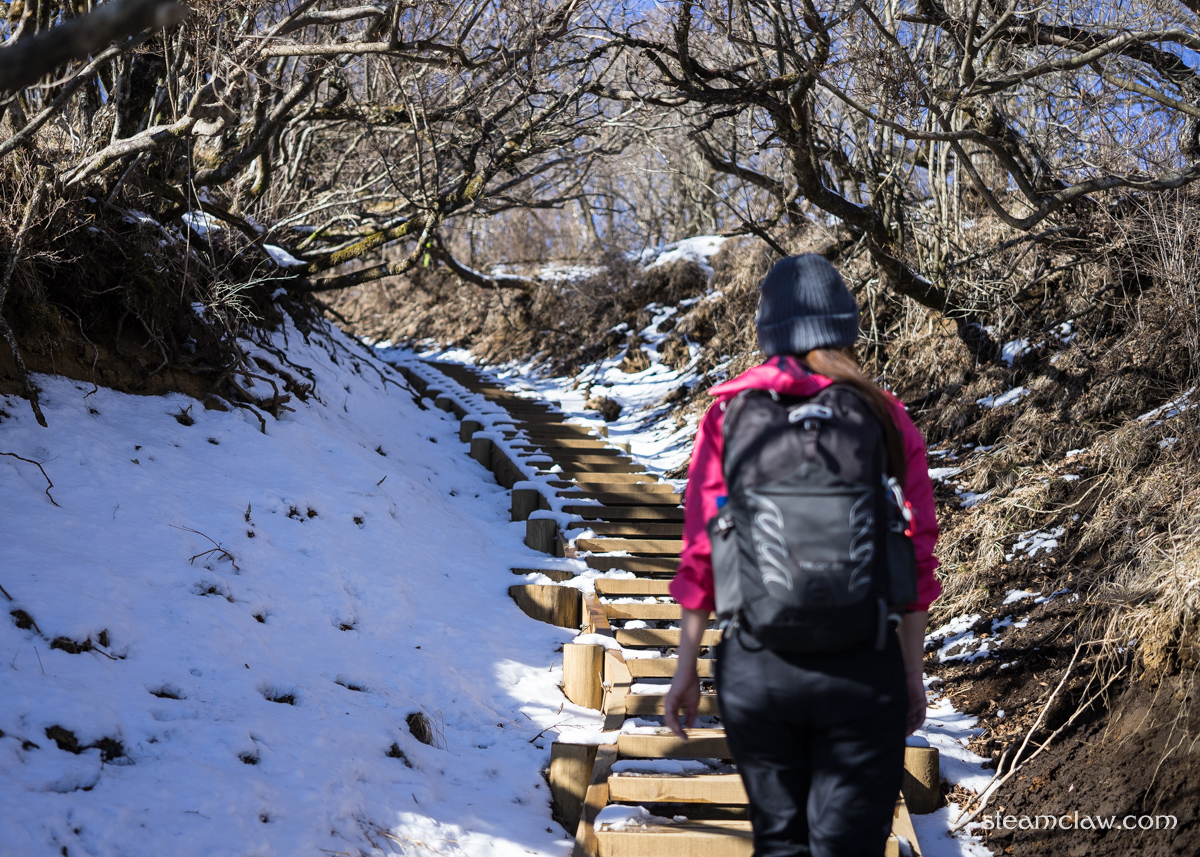 北側斜面を下っていくので積雪があった後などは凍結していることが多い箇所ですが,勾配がそこまでないのでアイゼンやチェーンスパイクはまだ不要.気をつけて鞍部まで下ったのちは,よく整備された階段を登り返して三ノ塔です.