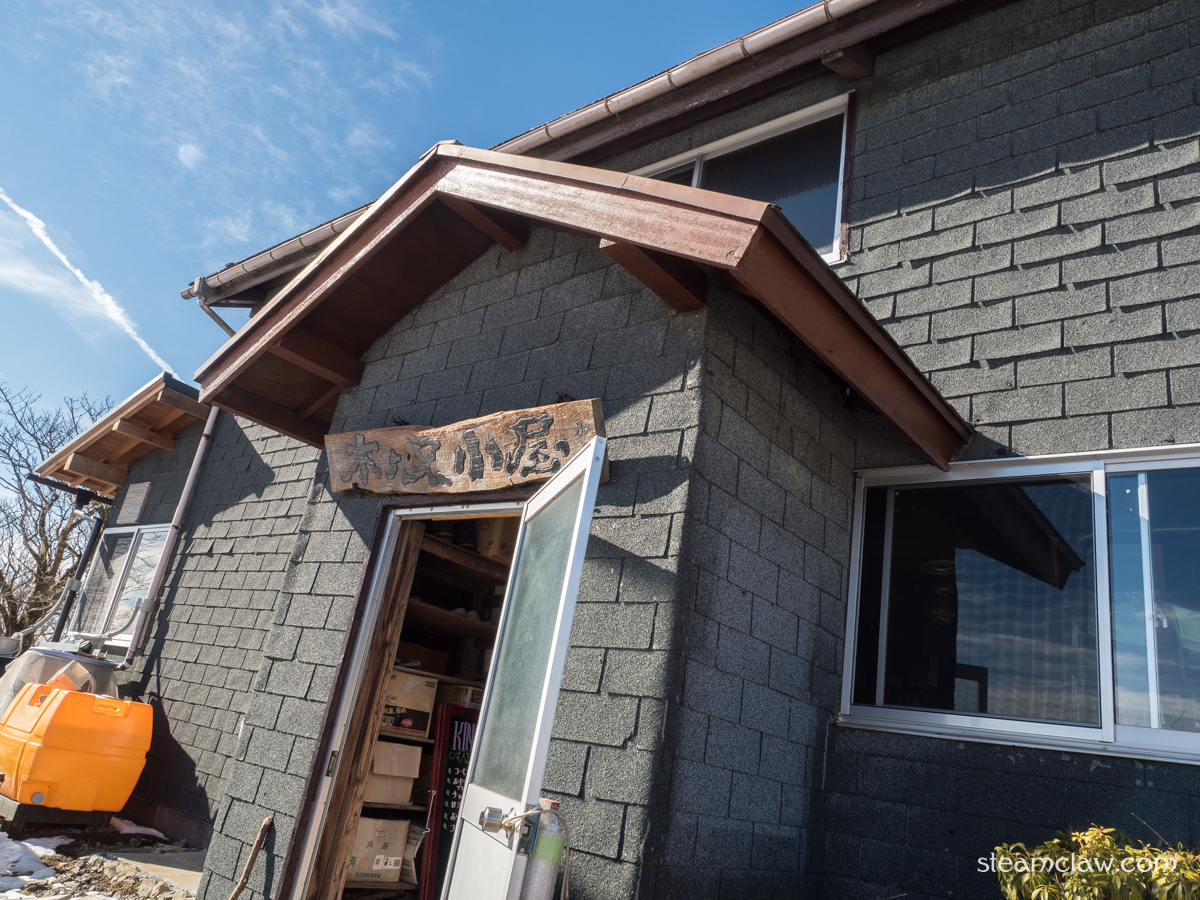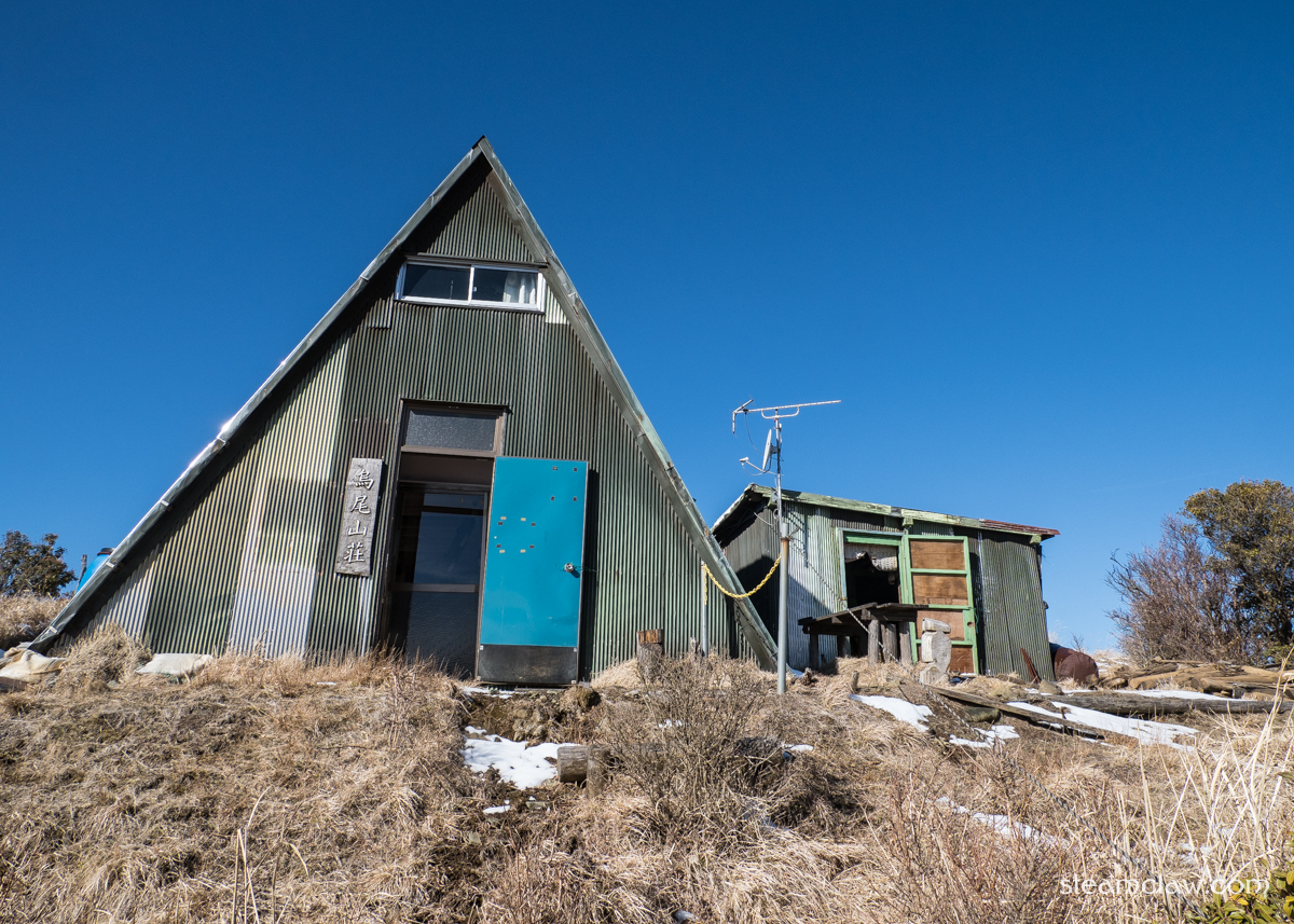 鞍部から,10分ちょっと登り返すと烏尾山荘.合掌造りスタイルの三角屋根が特徴的な山小屋ですが,通りがかっても営業しているのかいないのか,よくわからないことが多い(週末営業ということにはなっています)印象.この日はドアが空いており営業しているようでした.