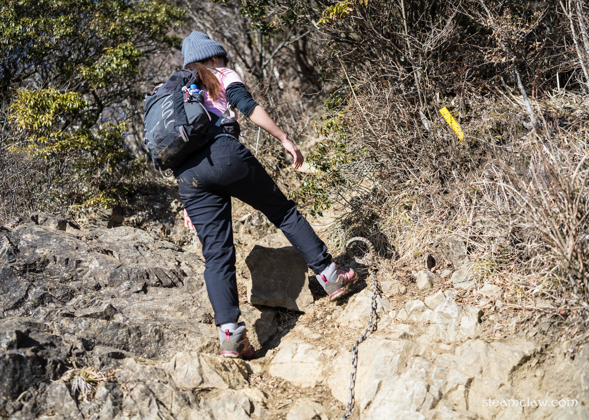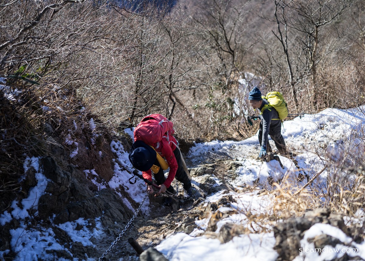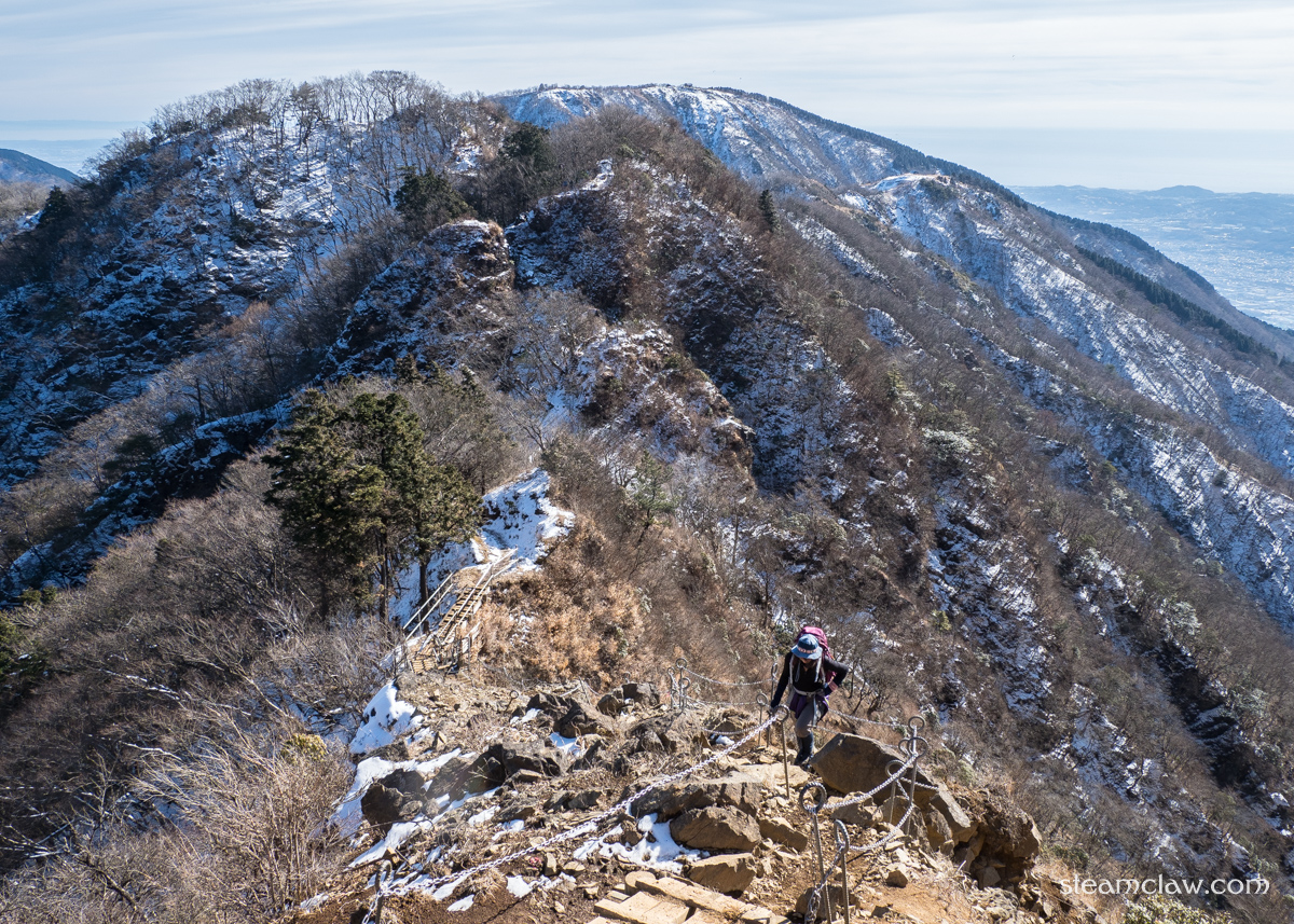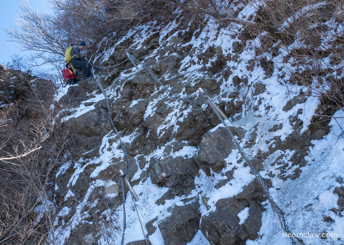 行者ヶ岳の頂上につくと,今度は政次郎ノ頭との鞍部へと下っていくのですが,ちょこちょこ岩場・鎖場があり,最大のものは落差10メートル近くあります.これも表尾根コースのハイライトの一つですね.慣れればなんということはないのですが,初見だと人によっては結構ビビる高さがあり,ハイシーズンにはちょっとした渋滞になることもしばしば.