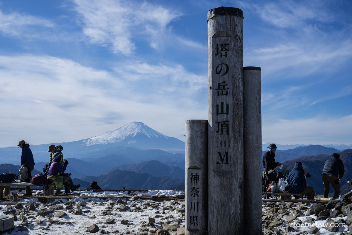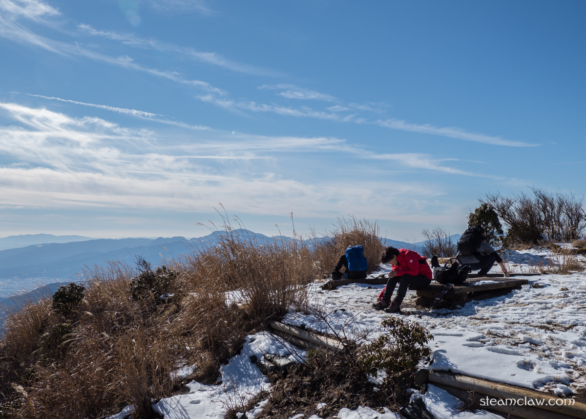 塔ノ岳山頂には13時30分頃に到着.山頂に「ベンチ」はないのですが木板があちこちに並べてあるので,そこに座って休憩することができます.大倉尾根からも大勢のハイカーが登ってくるので山頂は大賑わいで,皆さん記念撮影をしたりラーメンを沸かしたり,思い思いに過ごしてらっしゃいました.