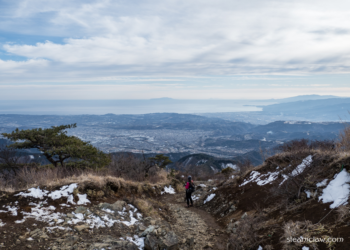 登山口から30-40分ほど登ったところにあるベンチを過ぎると樹林が薄くなり,二ノ塔に向けた登りも終盤に差し掛かってきます.途中にはヤビツ峠を挟んで大山と湘南の街並みを望むことができる展望スポットもあり.もう1つのメジャーな登山路である大倉尾根は終盤の終盤までずっと樹林帯なので,こうして眺望を楽しみながら登ることができるのが表尾根の魅力です.