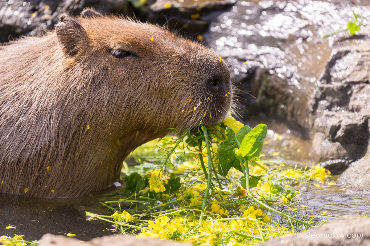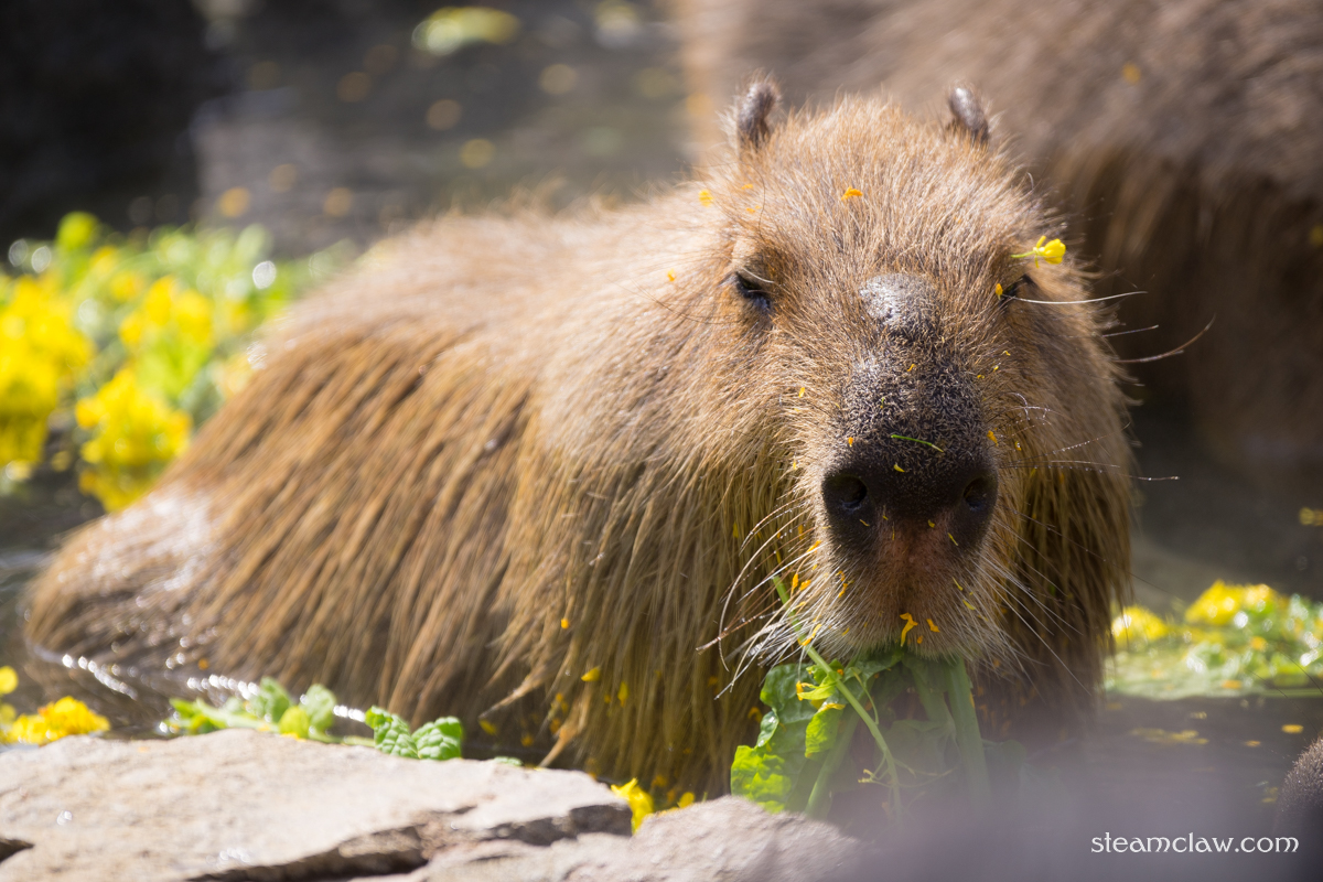 カピバラの露天風呂というと柚子湯のイメージがありましたが,この日は菜の花湯.飼育員さん曰くカピバラさんたちは食べられる菜の花湯のほうがお好みだそうで,入浴開始から20分後には大方食べつくされていました💧