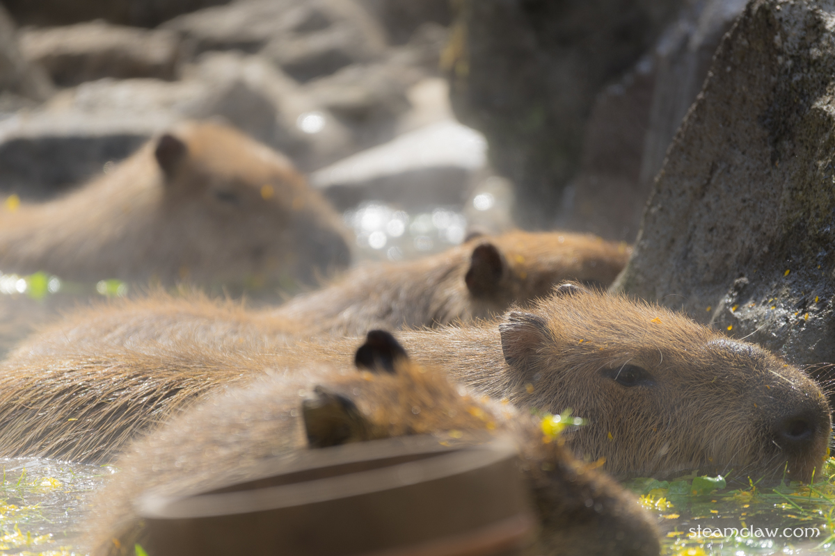 この眠たそうな表情がなんともラブリー😚ですね.カピバラの露天風呂は決まった時間のみ開催.そんなにうまく入浴してくれるのかと疑問だったのですが,南国出身のカピバラさんは暖かいのがお好きなようで,露天風呂がお湯で満たされはじめると我先に入浴していました.