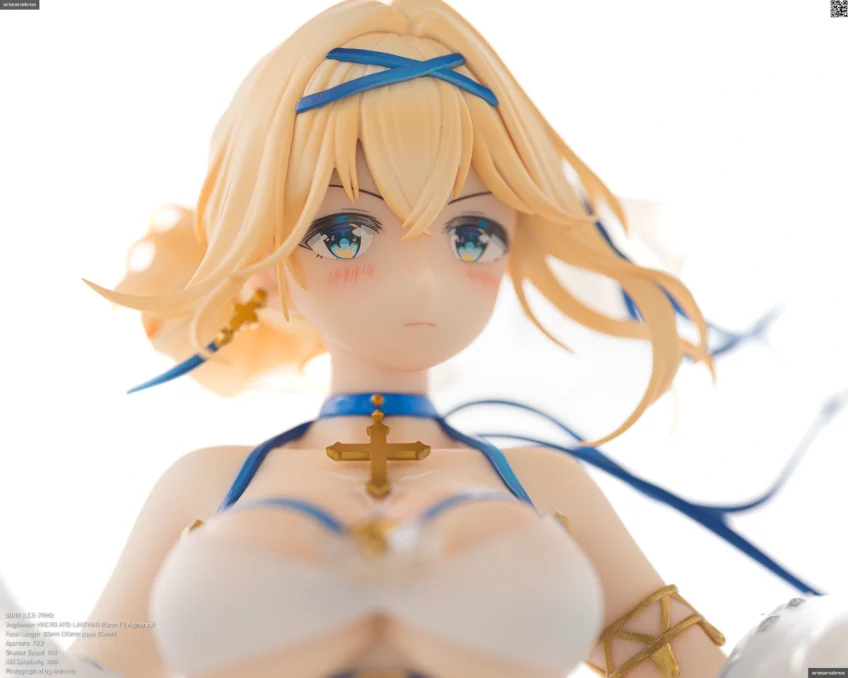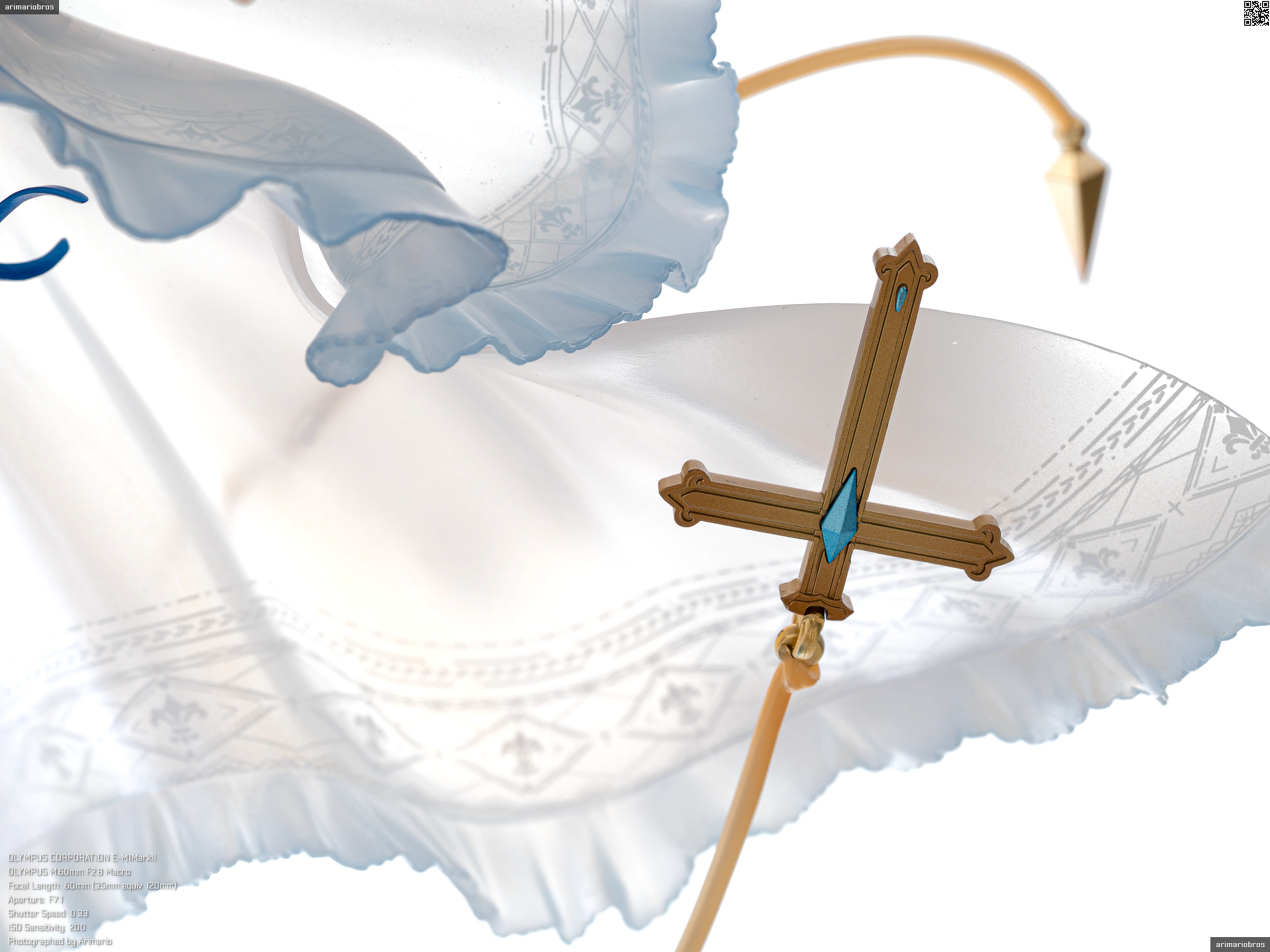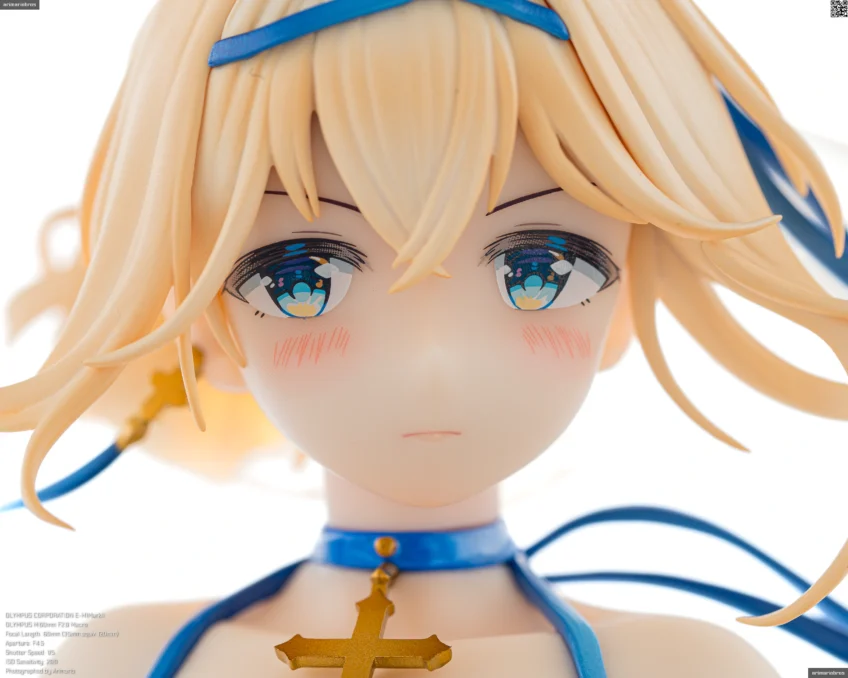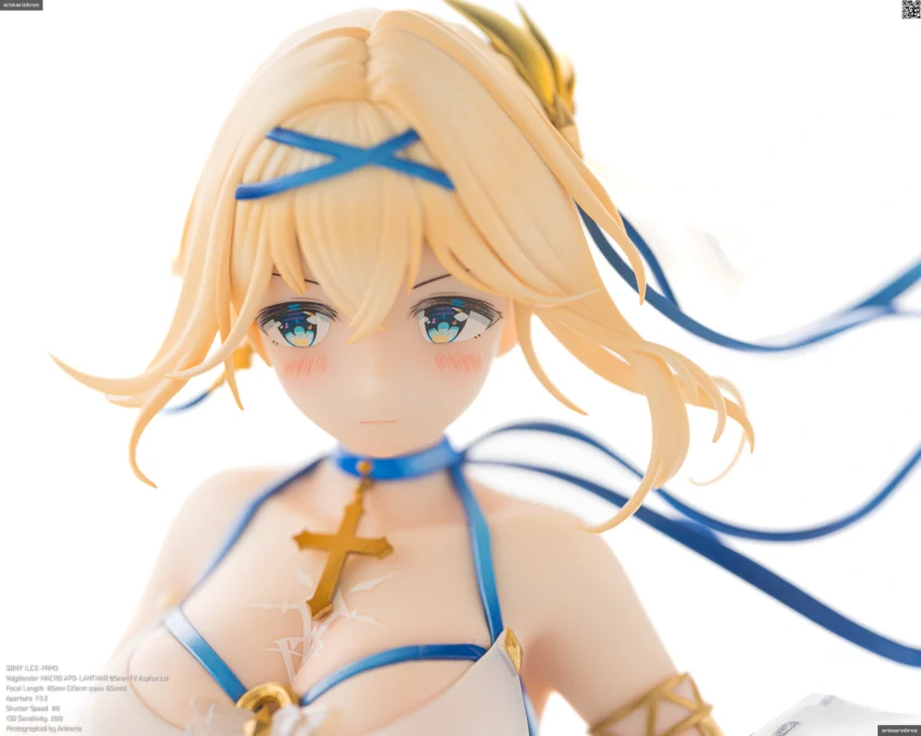 頭部にはブルーのヘアバンドとリボン、十字架をモチーフとしたイヤリング、そして薄布の髪飾りを着用。髪飾りはクリアパーツです。アクセサリーはいずれも、いずれも目立つ塗装のはみ出しなどなく、細かいところまでしっかり仕上げられていますね。