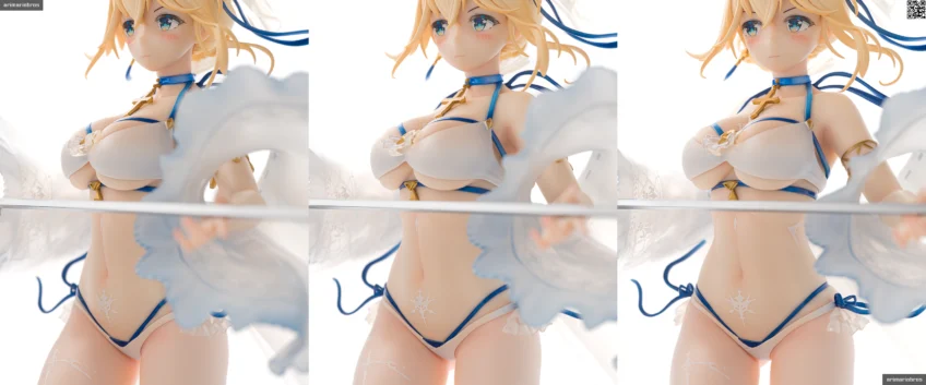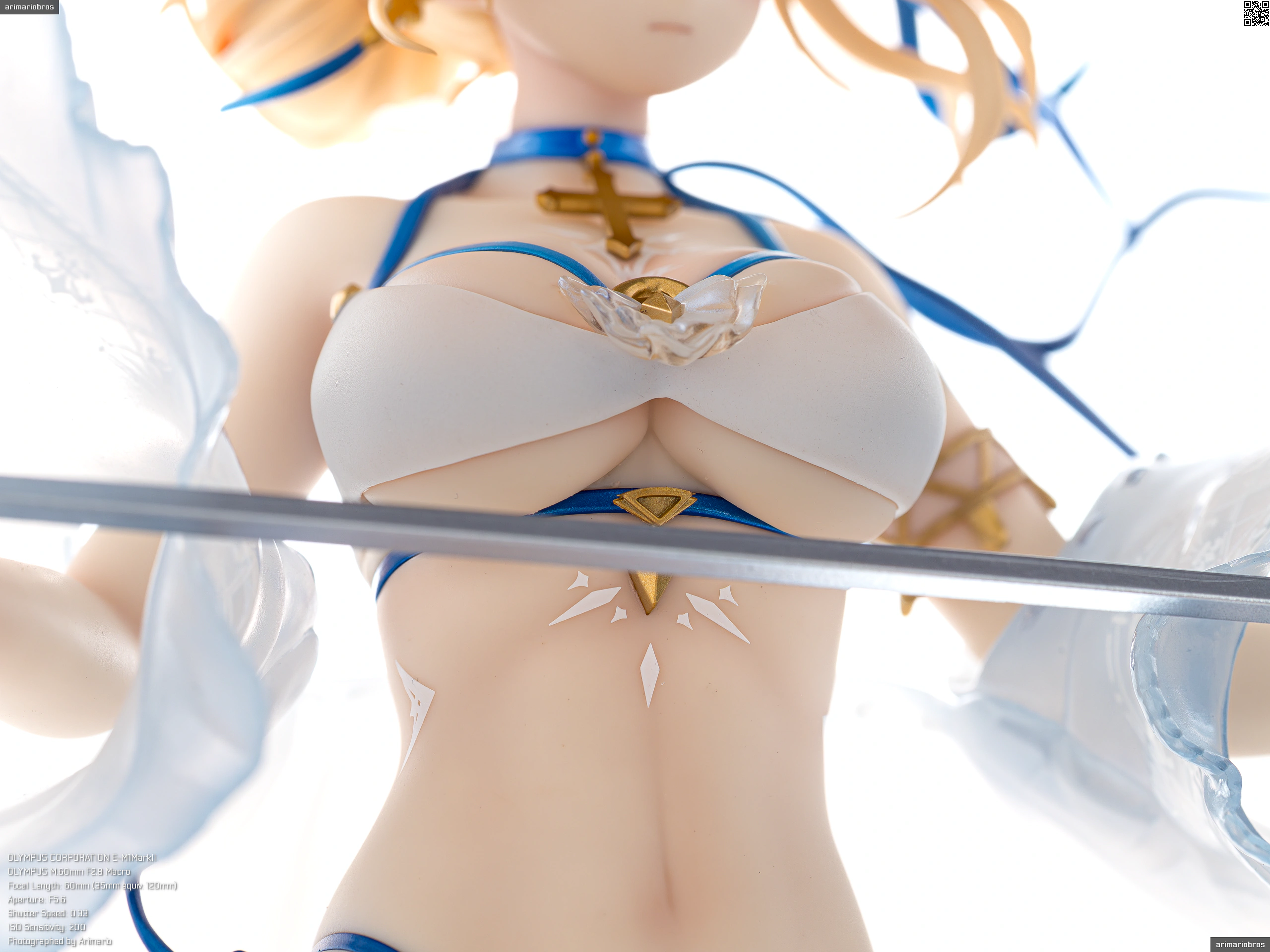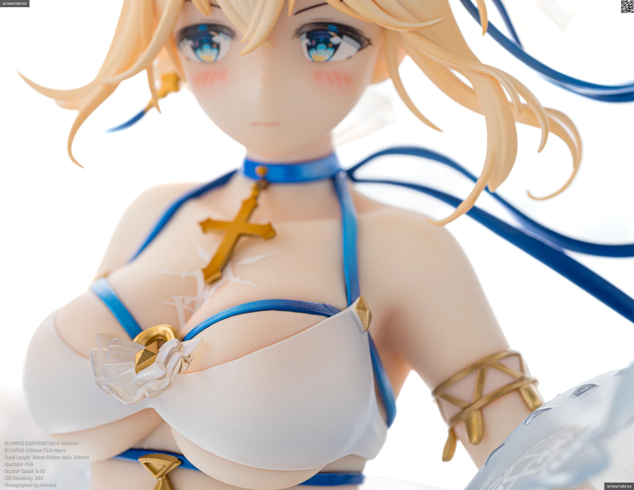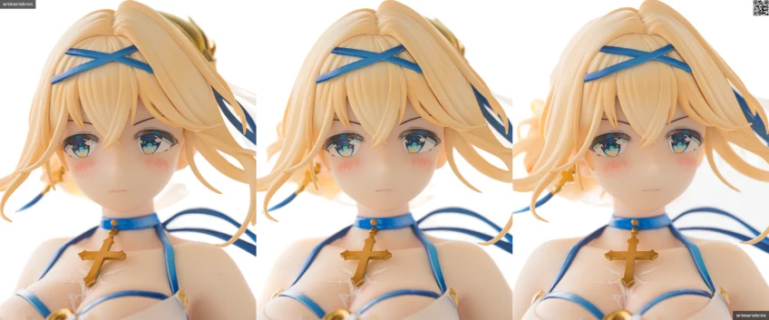 アリスグリント公式サイトやホビーショップなどに掲載されている彩色見本のサンプル画像は白を強調しているようで、強めにピンクのハイライトが入っているほかは色白感がありますが、実物のフィギュアは思ったよりも肌色の強い色味です。水着なので健康的な肌色でも違和感ありませんが、もともと聖騎士モチーフなので美白のほうが良いという意見もあるでしょうし、このへんは好みが分かれそうですね。