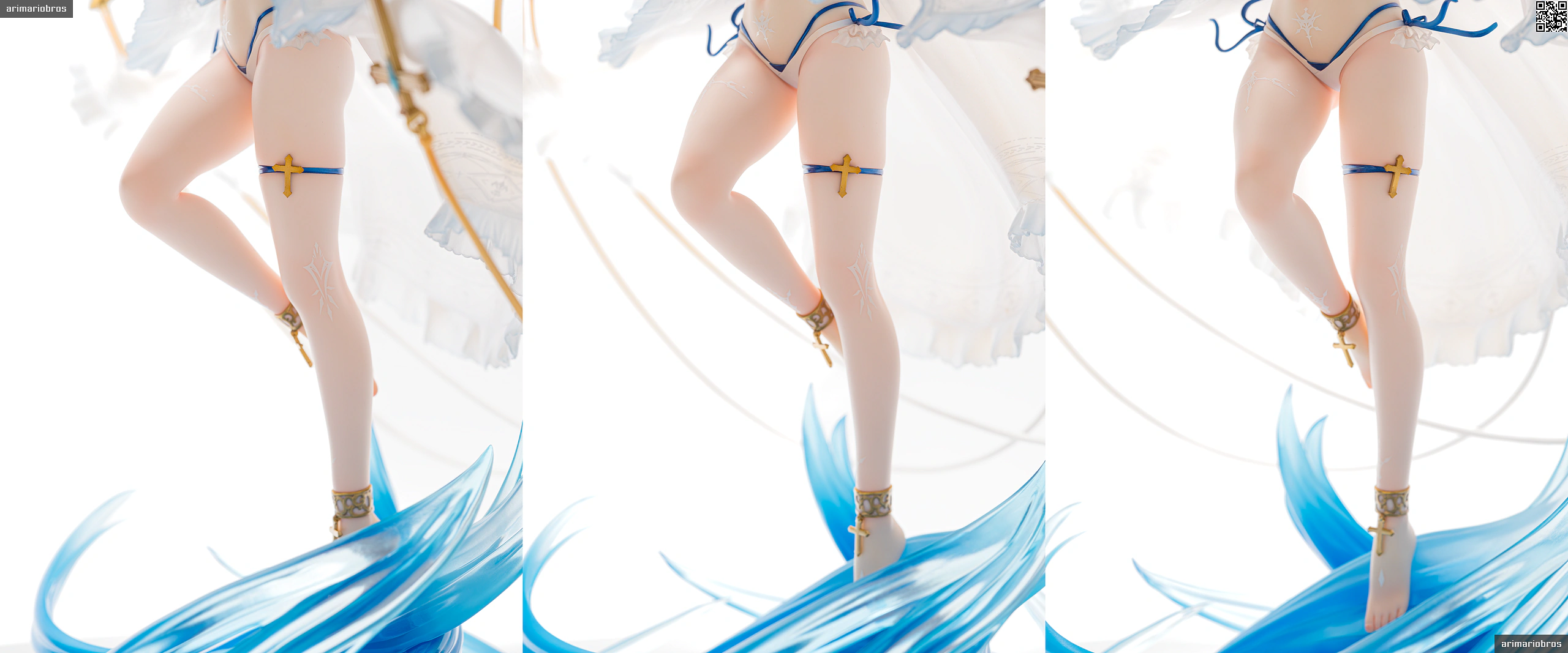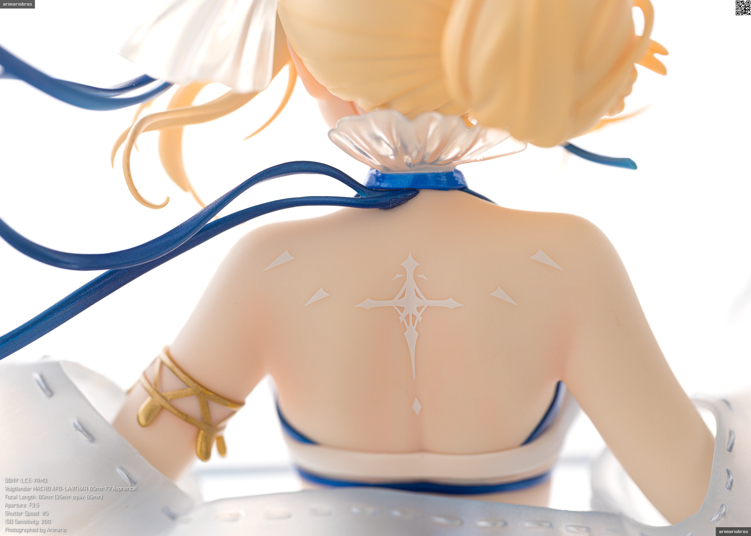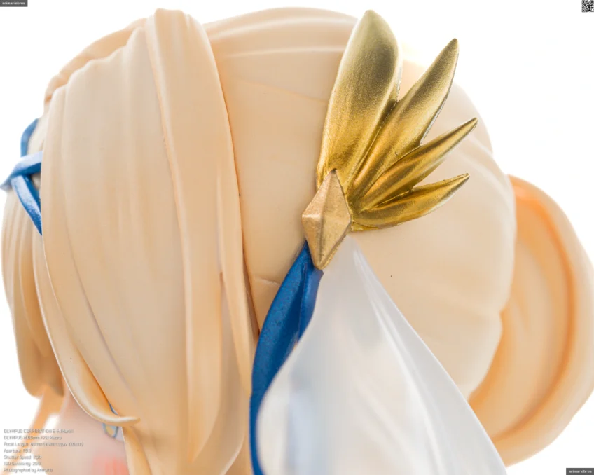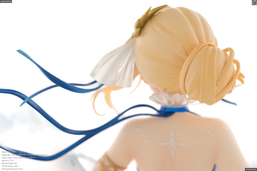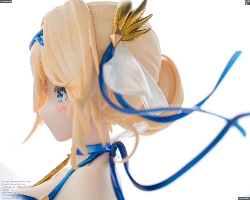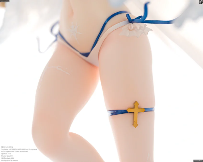 髪の毛まわりと同じく、青のリボンやゴールドのアクセサリーがアクセントとして添えられています。特に胸元の十字架モチーフのペンダントはグラデーション塗装が美しい。背中や胸、腹部にある模様は聖痕という設定だそうで、細かい模様ですがキレイな仕上がり。ペイントは手間だと思うのでデカールでしょう。