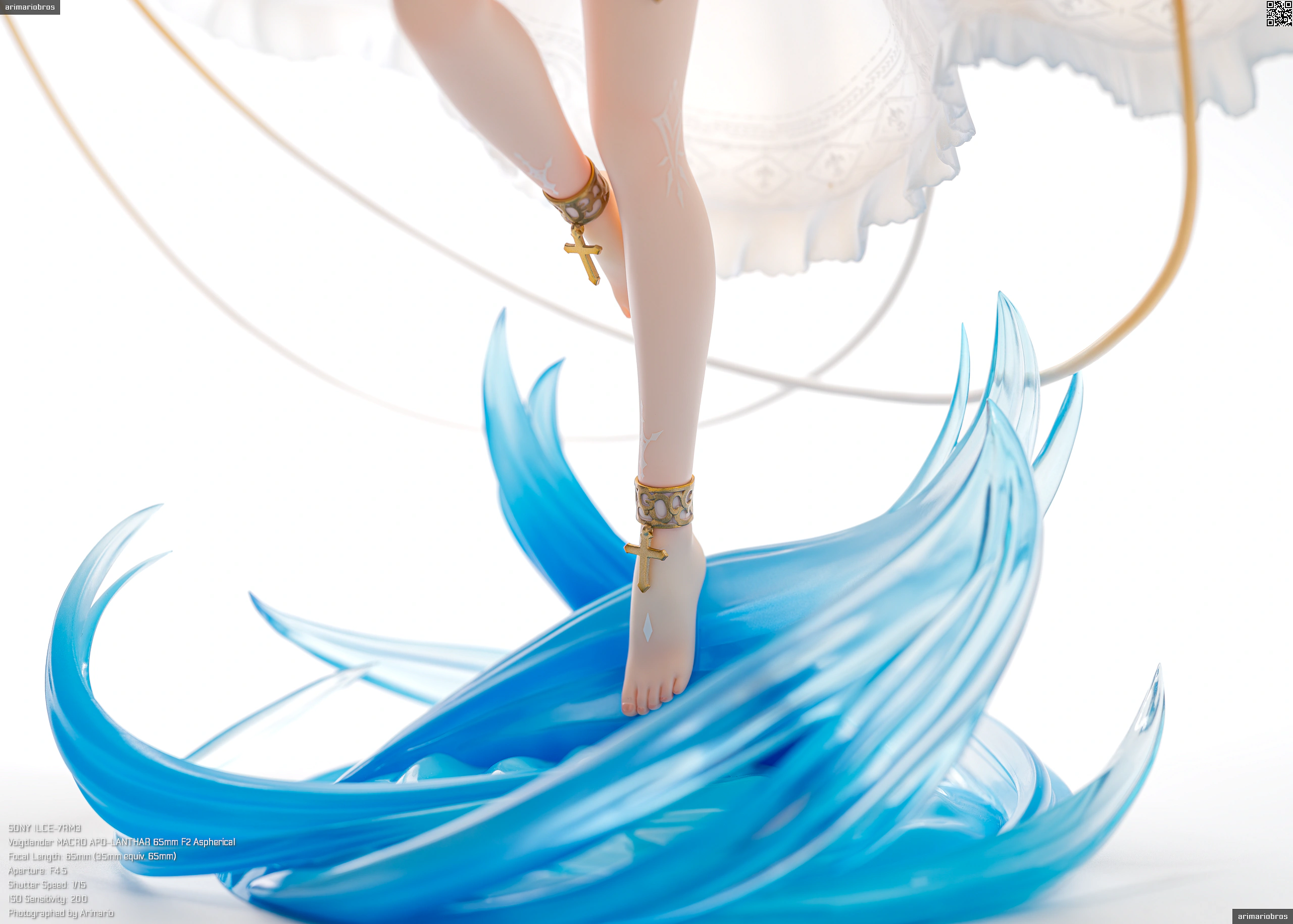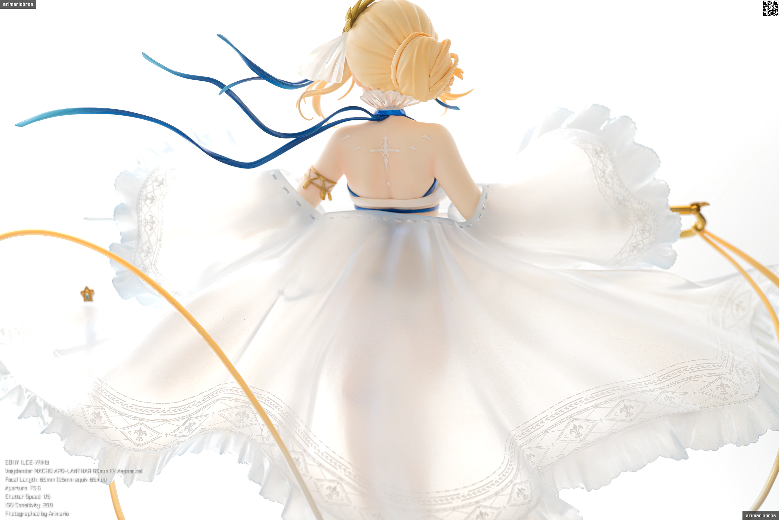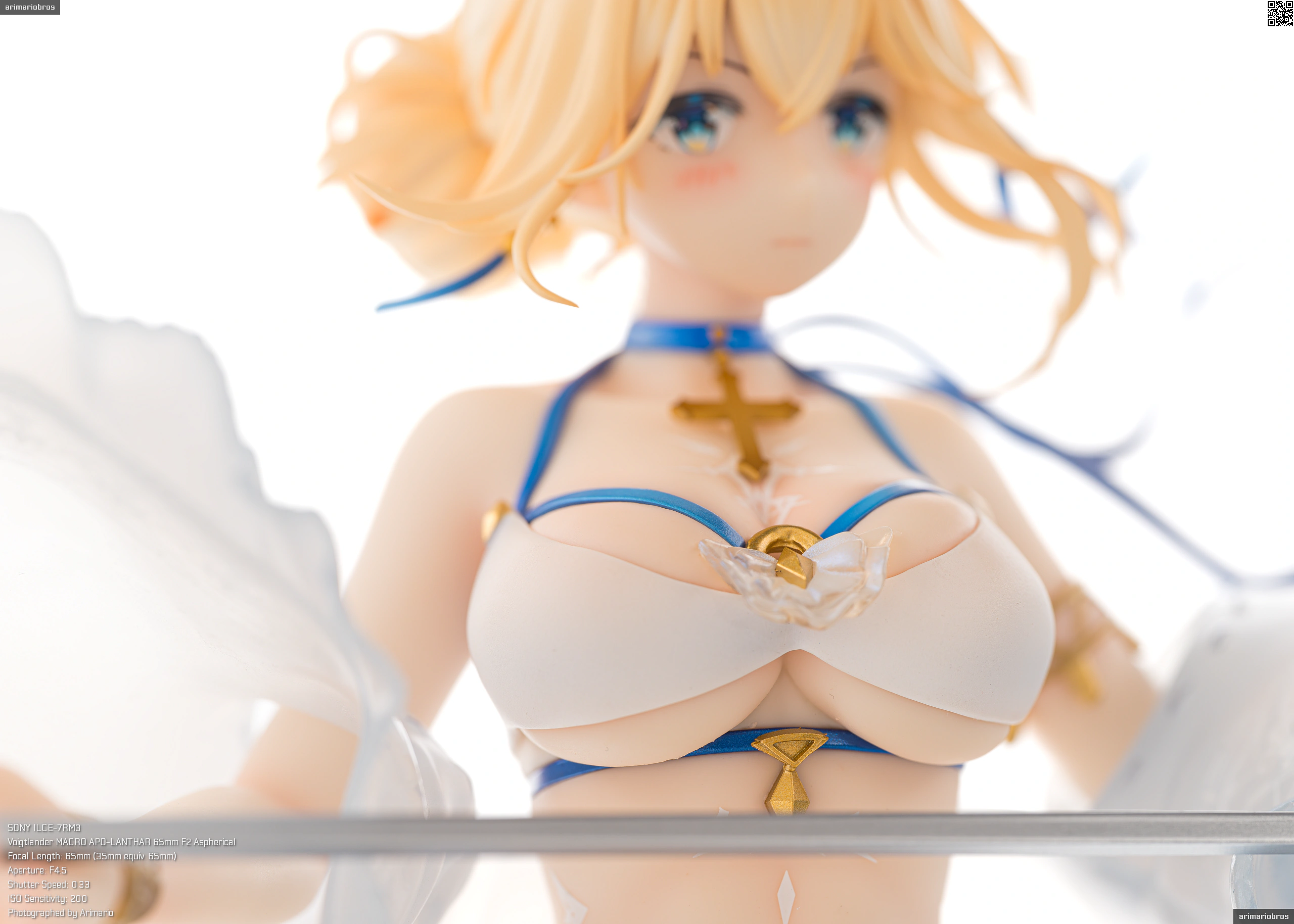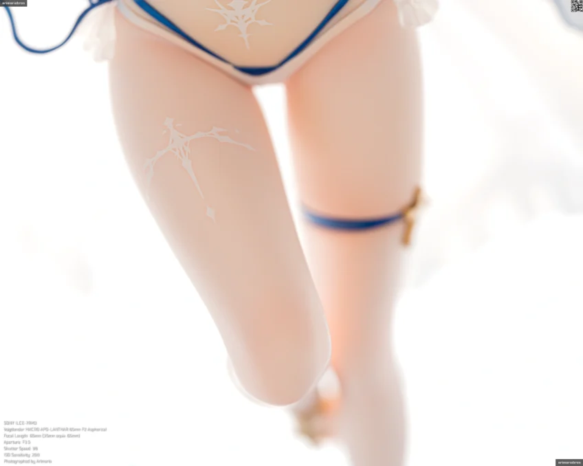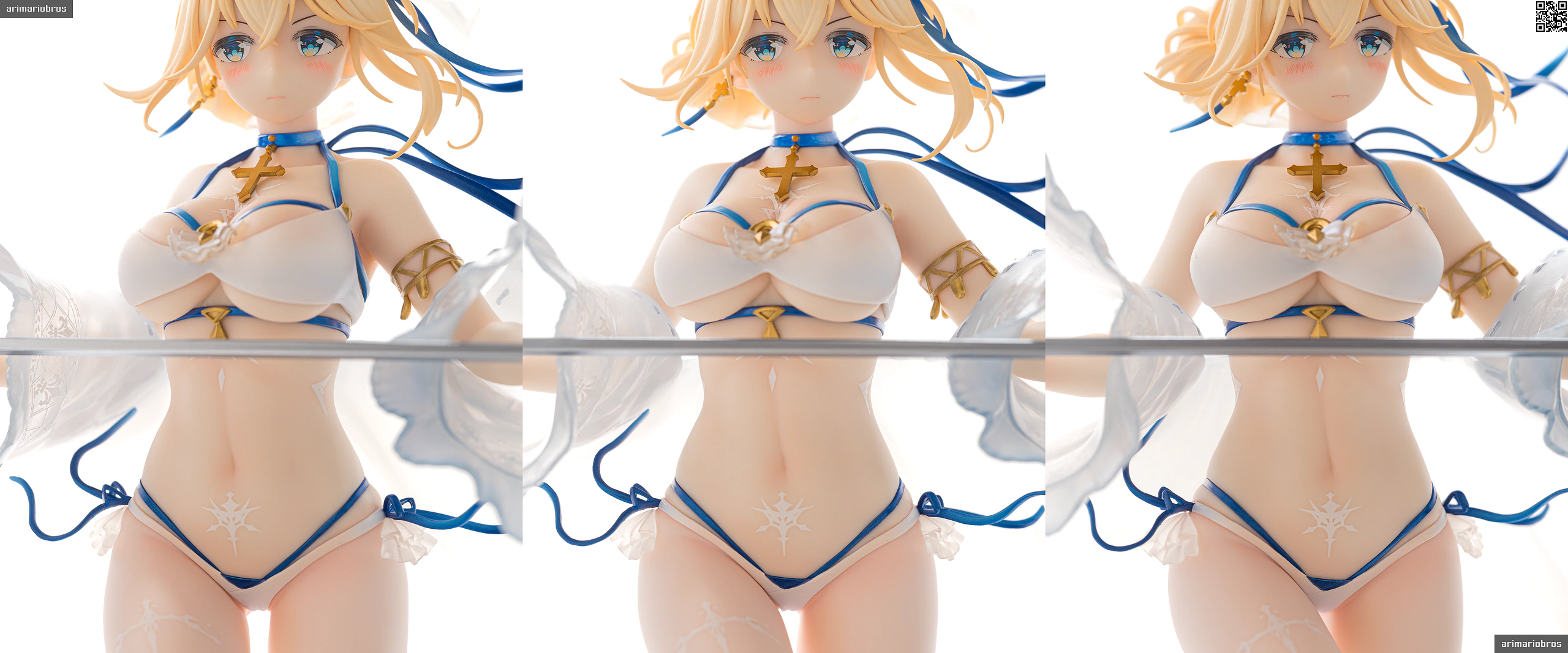 髪の毛まわりと同じく、青のリボンやゴールドのアクセサリーがアクセントとして添えられています。特に胸元の十字架モチーフのペンダントはグラデーション塗装が美しい。背中や胸、腹部にある模様は聖痕という設定だそうで、細かい模様ですがキレイな仕上がり。ペイントは手間だと思うのでデカールでしょう。