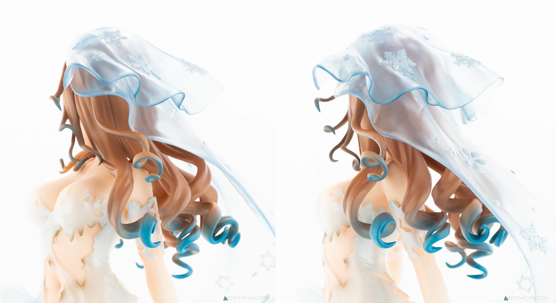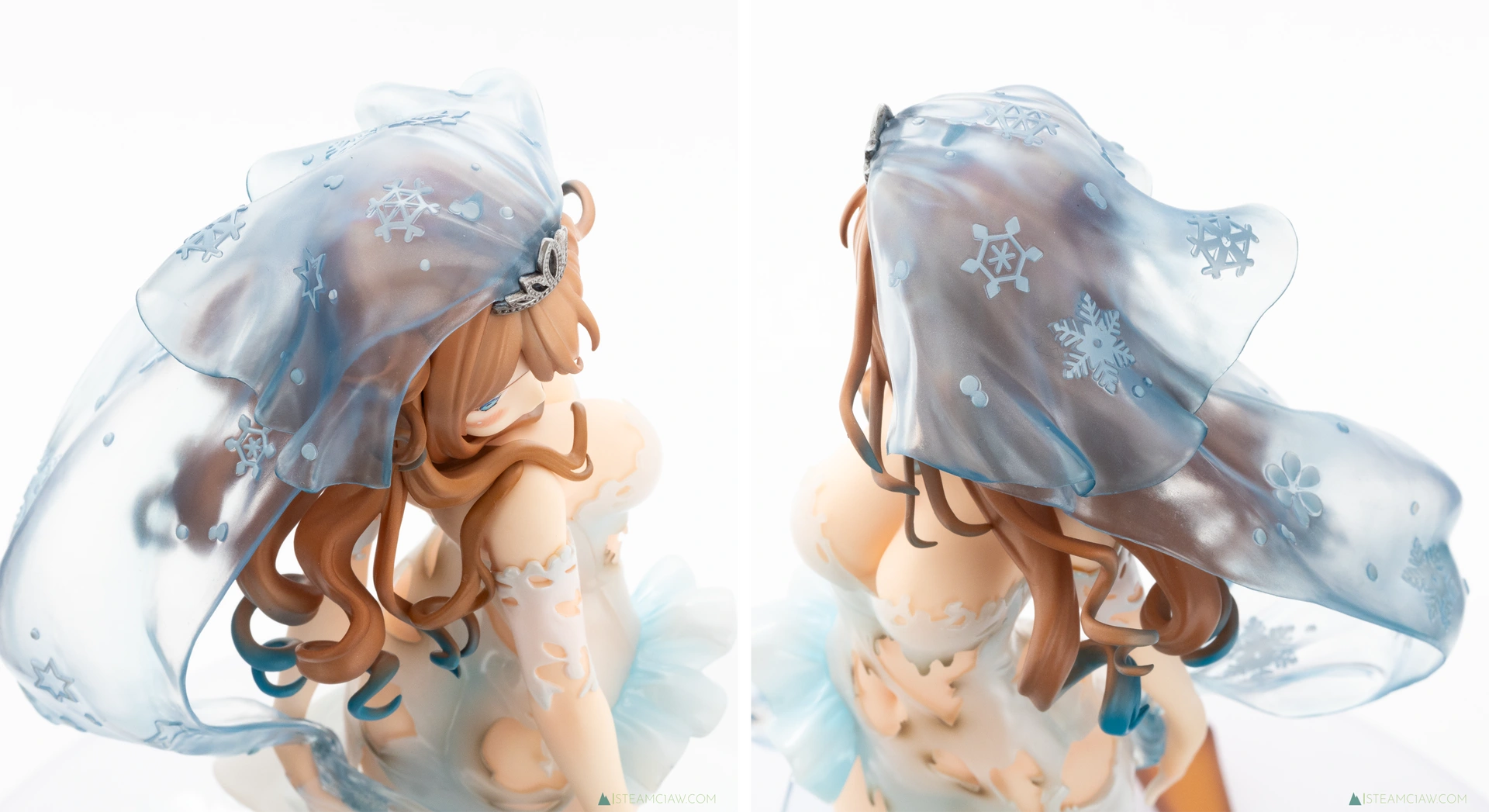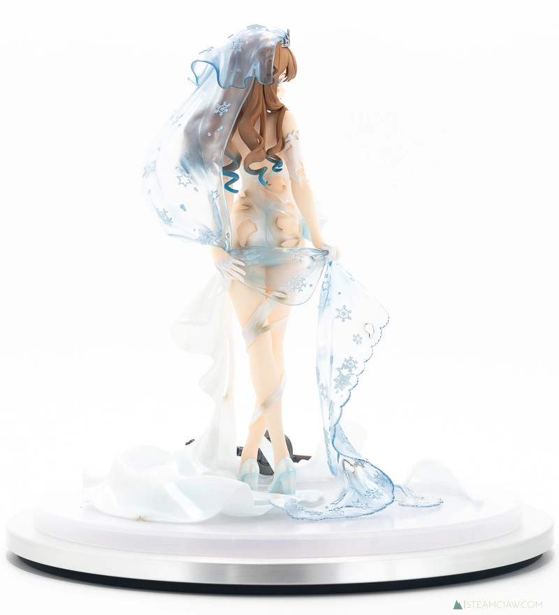 頭に被っているヴェールはクリアパーツで表現。雪国出身のキャラクターということで雪の結晶を模した模様があしらわれていますが、これもきっちり再現されています。さすがに物理的な薄さまでは再現できていませんが、頭からヒップにかけてヴェールがふわっと立体的に広がっており、透明感とあわせて「これは軽い布なんだな」ということが一見してわかる造形になっているのは見事でしょう。