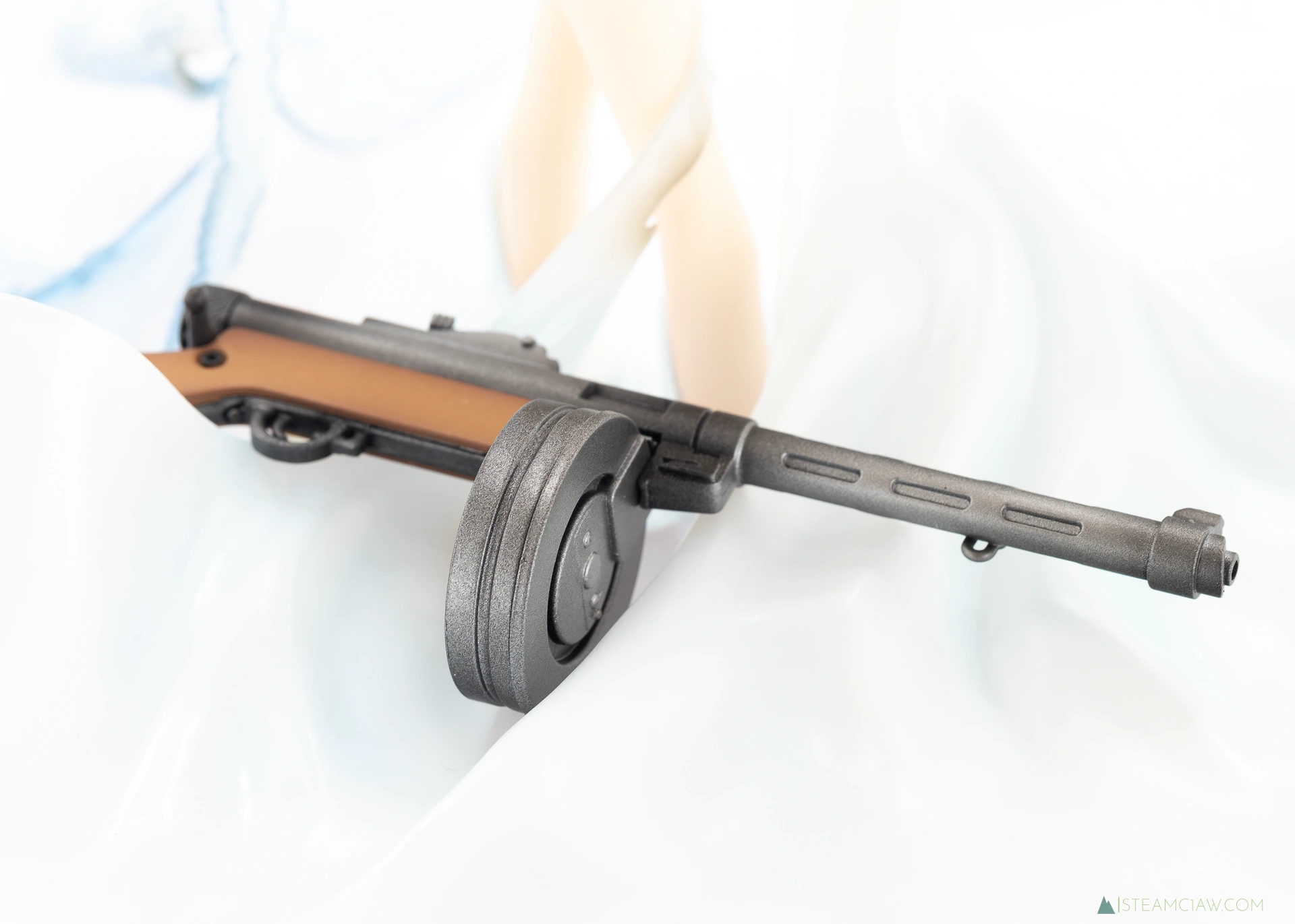 付属品としてミニチュアのスオミ銃が付属。冒頭のほうで触れましたが、非固定タイプ。スケールは小さいながらもトリガーやボルトレバーなど細かいところまでしっかり作り込んであります。元絵 (立ち絵のほう) だとドレスの下敷きになっていますが、さすがにそこまでの再現はできませんね😅