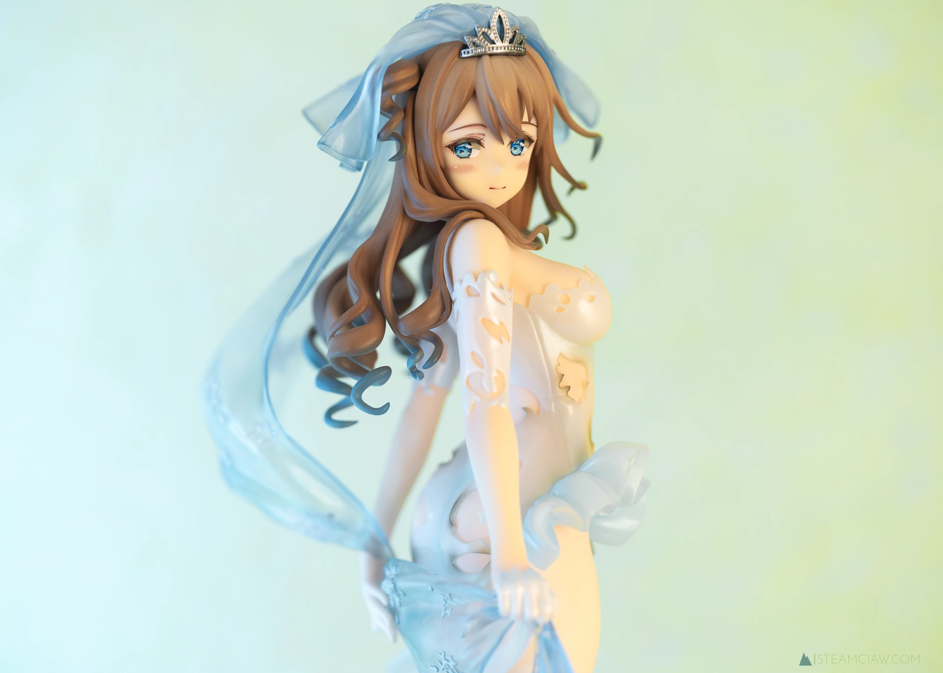 見てのとおり、ドレスはツヤのあるパール塗装でゴージャスな仕上がり。ヴェール、髪の毛のハイライト、瞳の色と、青色が随所に散りばめられているフィギュアですが、白と青のグラデーションはとても質感が高いですね。
