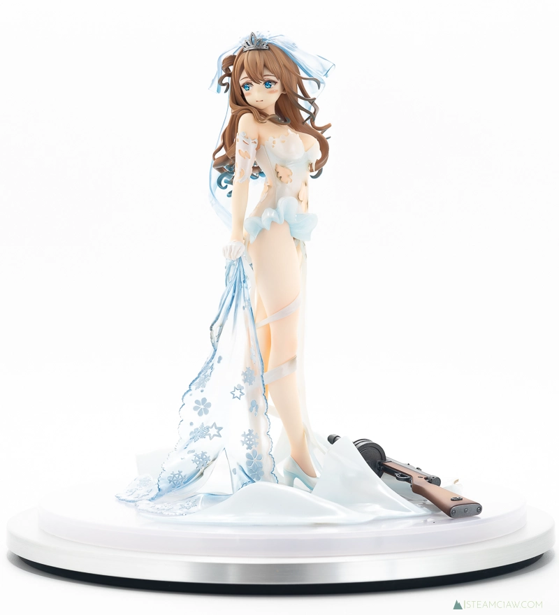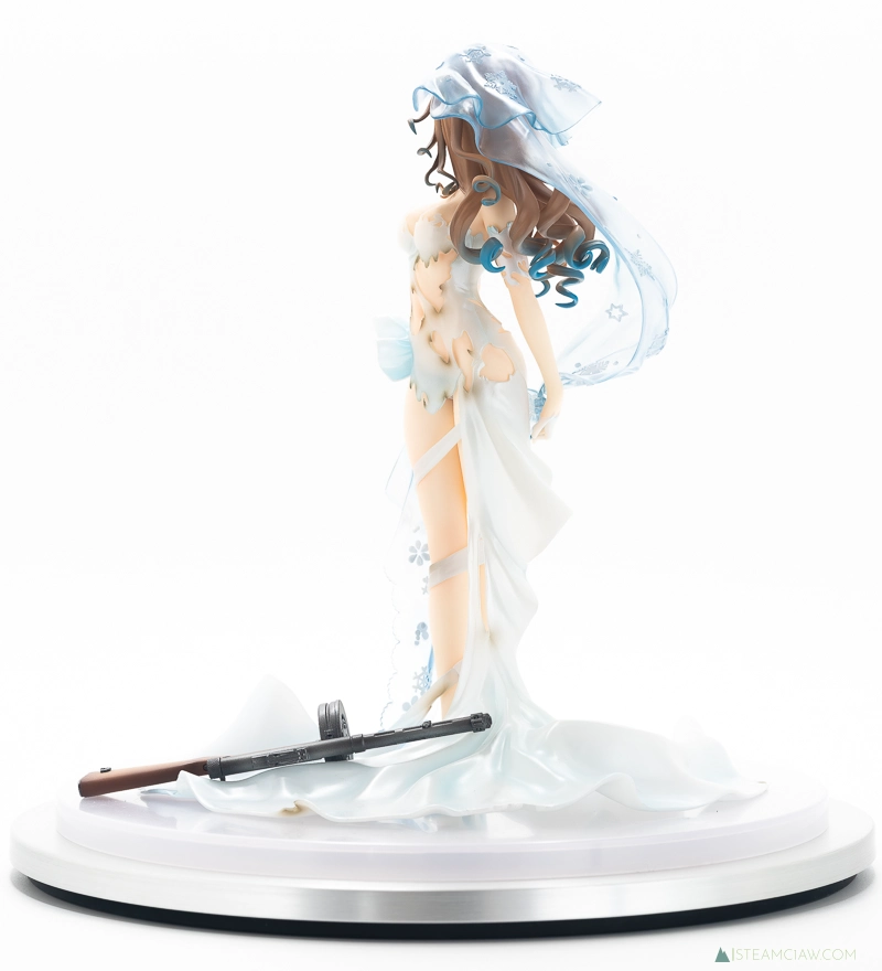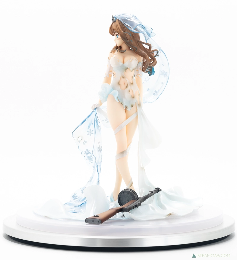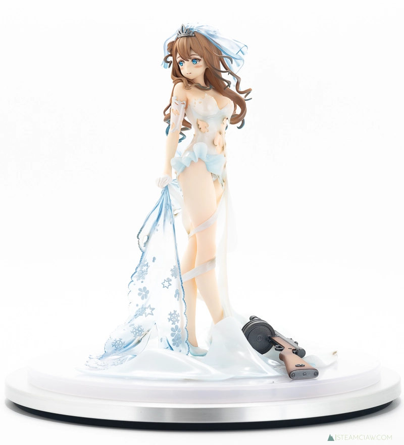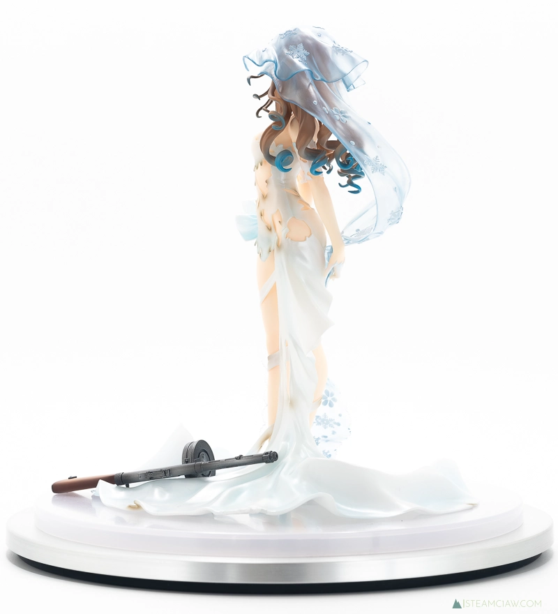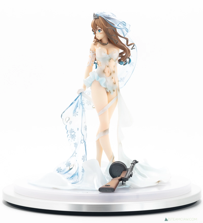 そんなスオミの花嫁衣装を立体化したのがこの「スオミ -幸せの使命 Ver.-」ですが、厳密には重傷バージョンの立体化となります。このタイプのスマホゲームはキャラ絵が「通常バージョン」と「重傷バージョン」に分かれていて、ゲーム進行中にキャラクターが大ダメージを受けると重傷バージョンに切り替わるという演出を採用しているものが多数あり、ドルフロもその一つです。